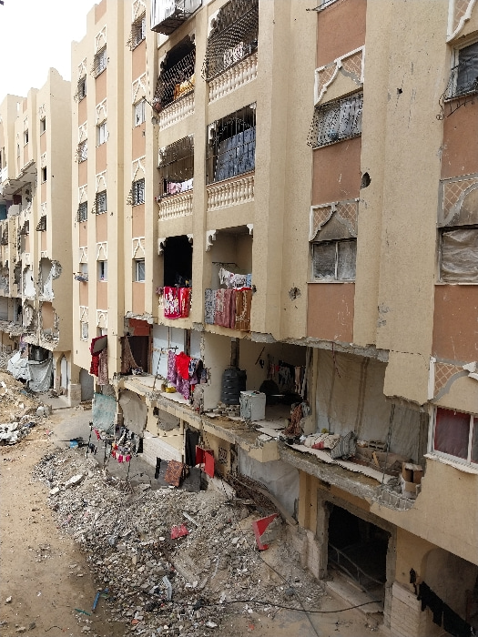 This image depicts a street scene in Khan Yunis, Palestinian Territory, characterized by extensive structural damage to multiple multi-story residential buildings. The buildings are constructed primar…read more