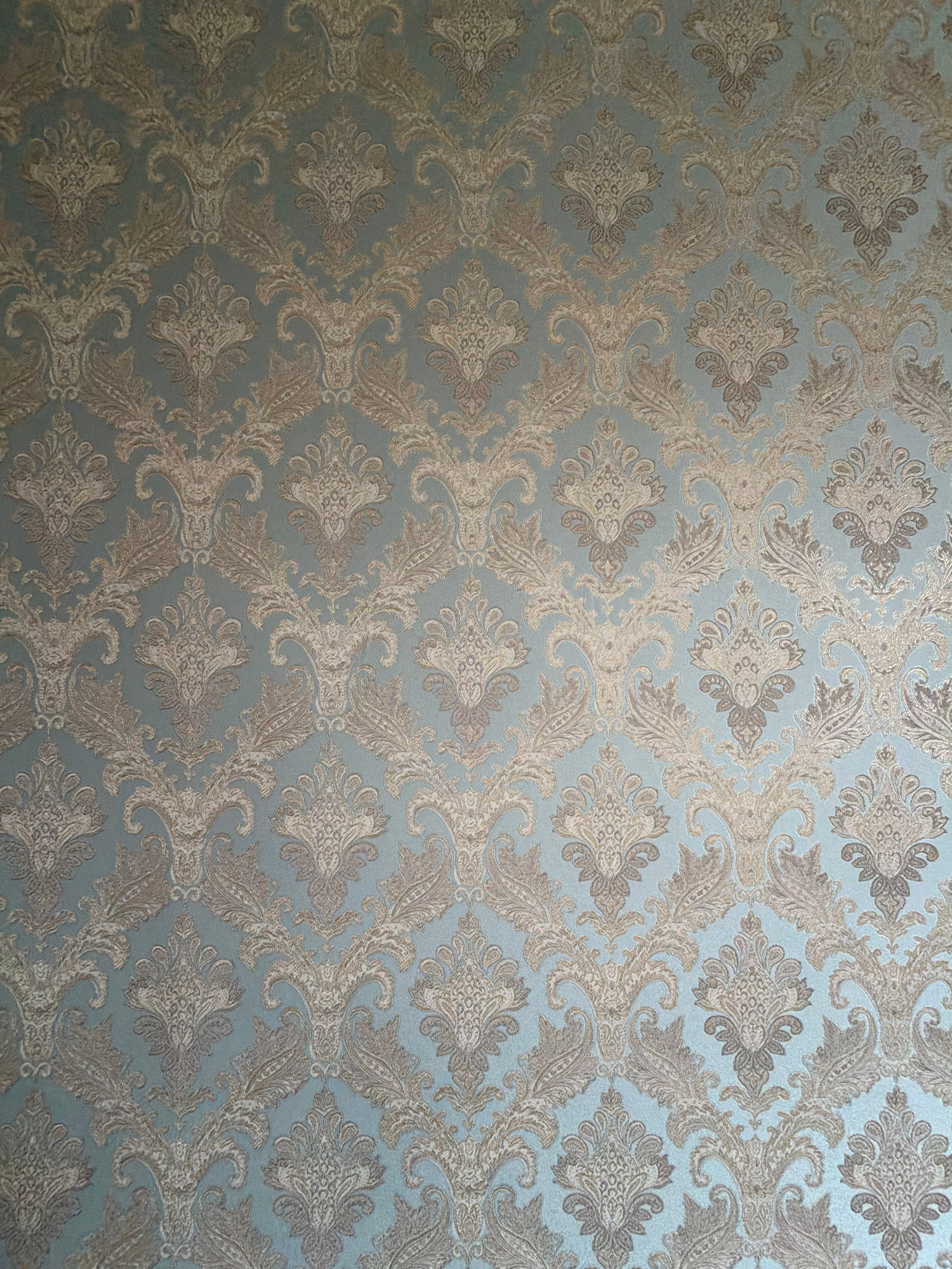 The image shows a close-up of a patterned wallpaper or fabric. The background color appears to be a muted blue-gray, and the pattern consists of repeating ornate floral and paisley-like motifs in shad…read more