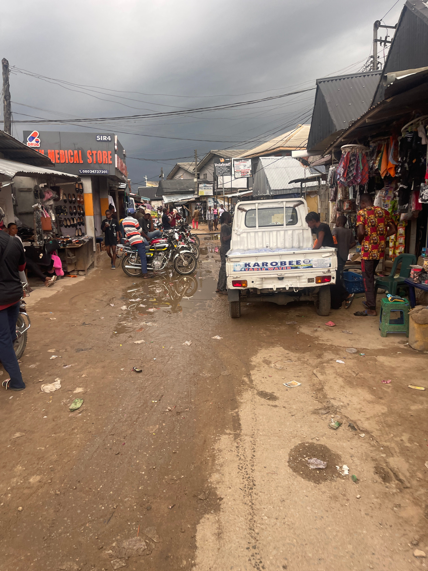 The image shows a street in Abraka, Nigeria, likely a market area, with a muddy or wet ground. A white truck with the word "KAROBEE" and "TABLE WATER" is parked along the right side of the street, wit…read more