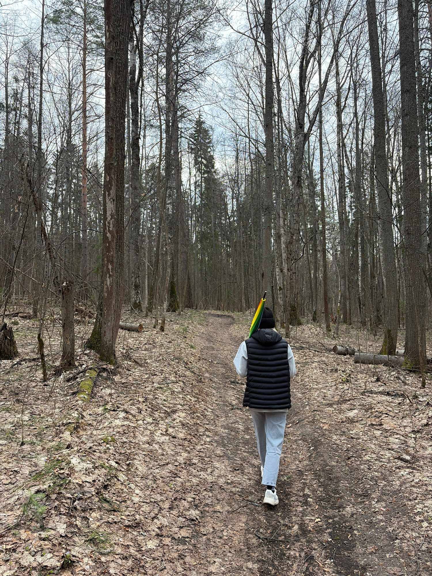 A medium, tilted shot of a person on a path in a bare forest. The person is walking away from the camera along the path. They are wearing a black puffy vest, light grey sweatpants, and white sneakers.…read more
