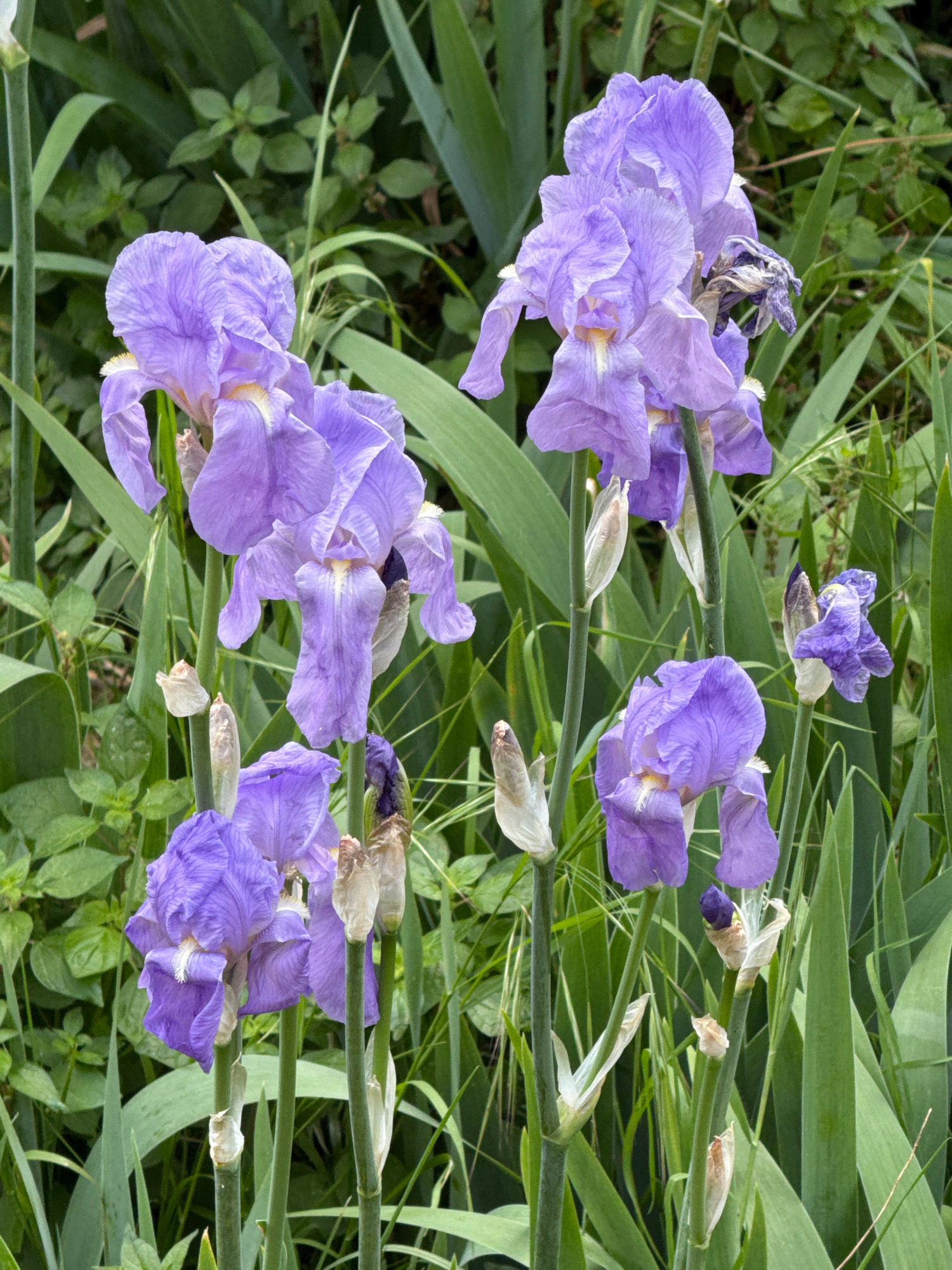 A close-up, slightly angled, outdoor shot of multiple light purple iris flowers in various stages of bloom amidst green foliage. The scene shows both fully opened flowers and buds. The image is likely…read more