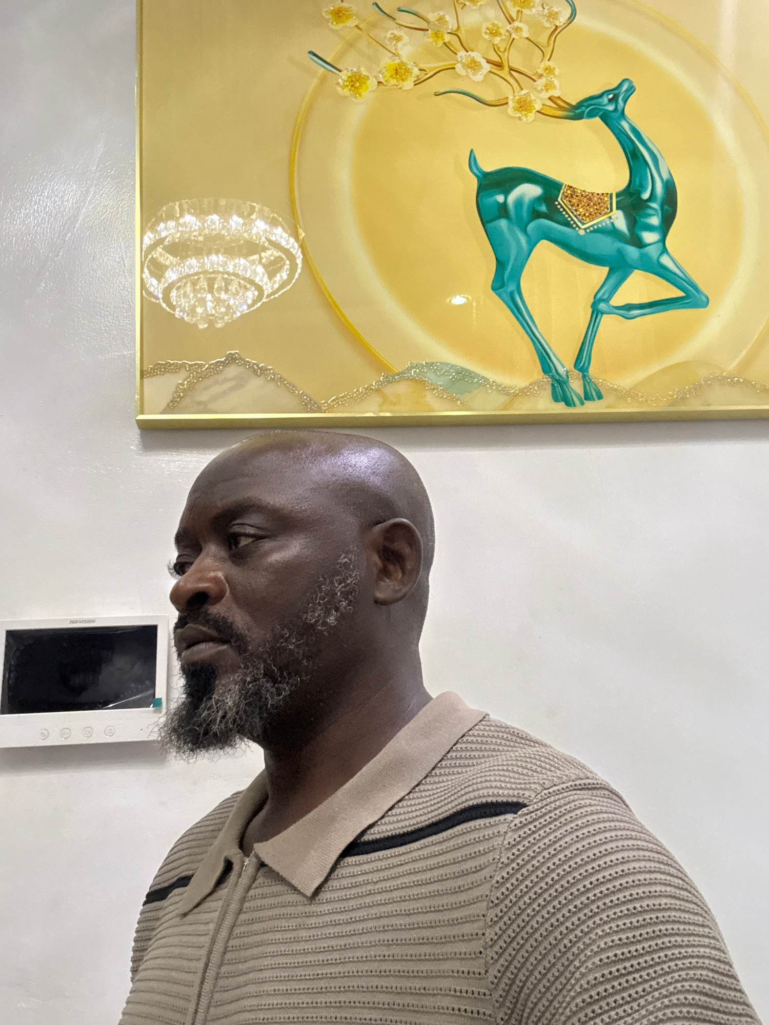 The image captures a close-up shot of a Black man with a bald head and a salt-and-pepper beard. He is wearing a tan knitted polo shirt with black stripes along the sides. He is positioned near a wall,…read more