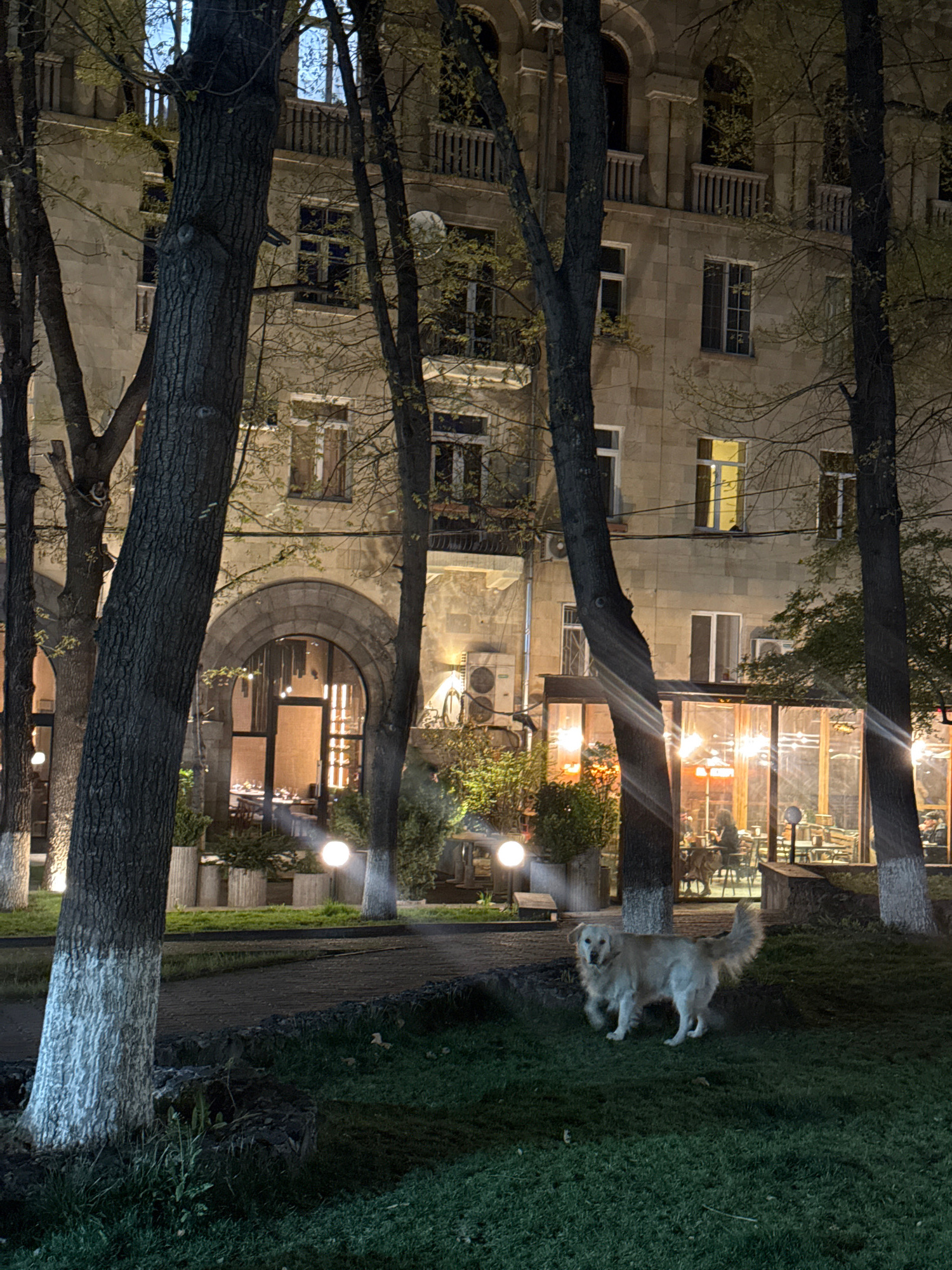 This nighttime image, set in Yerevan, Armenia, captures an outdoor scene featuring a multi-story stone building, several prominent trees, and a dog on a grassy area. The dark sky indicates it is lateβ¦read more