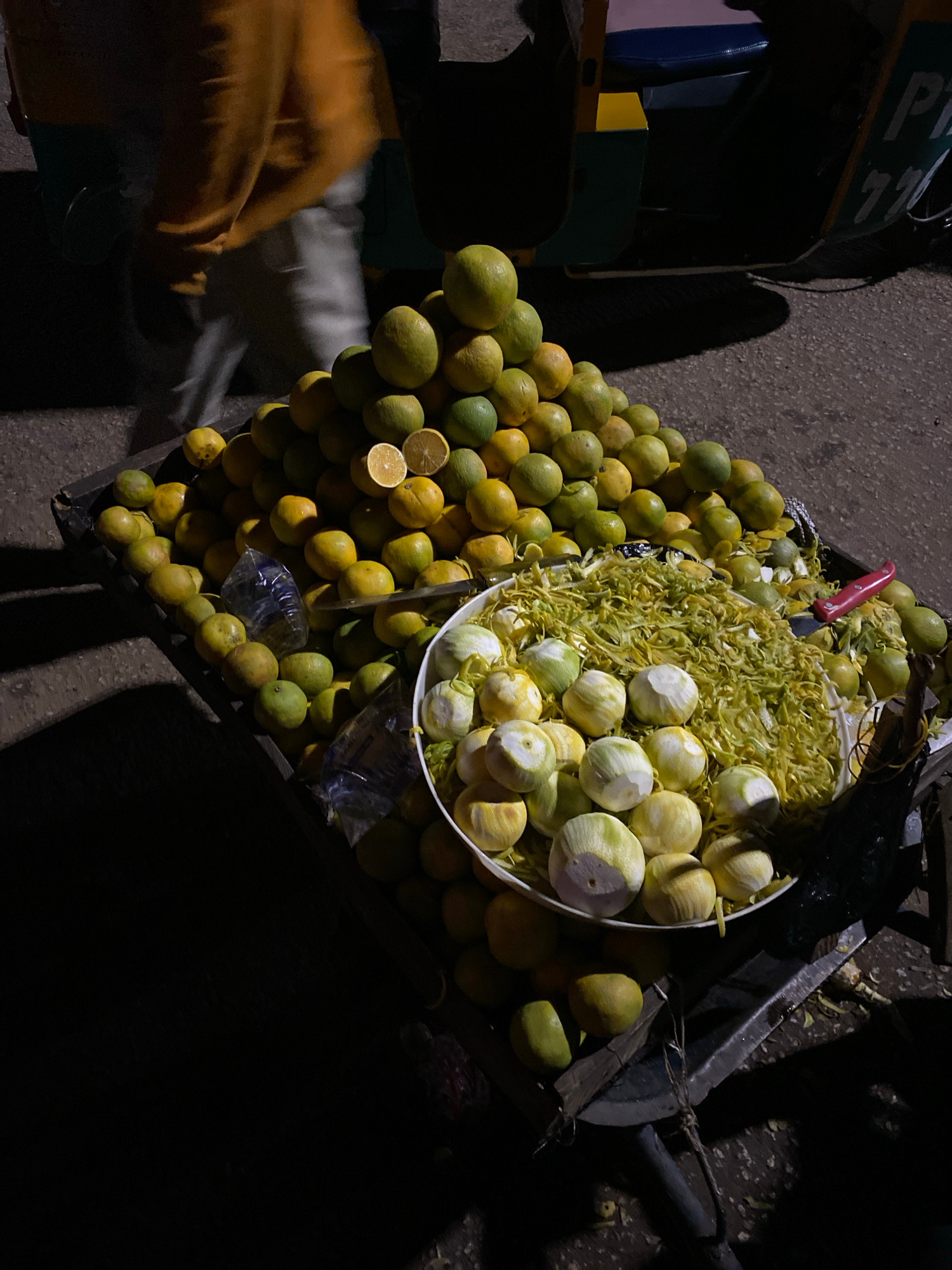 A high-angle, poorly illuminated photograph taken in Bukuru, Nigeria, shows a cart laden with citrus fruit, likely limes or lemons. The cart is positioned on a paved surface, presumably a street or si…read more