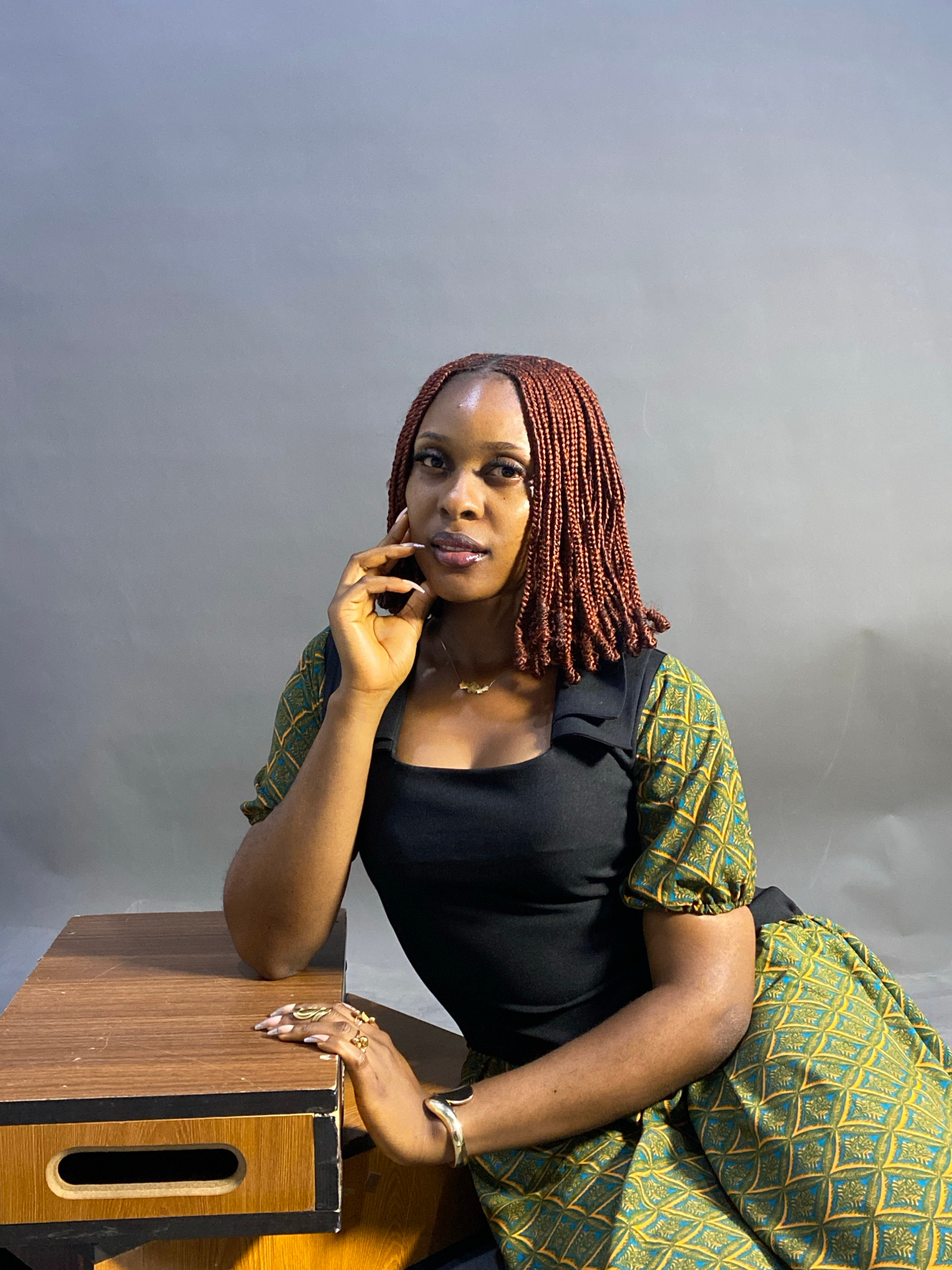 A woman is seated, leaning on a wooden box with an opening on its side. She has reddish-brown braided hair, a black top, and a green and yellow patterned dress with short puffy sleeves. She wears gold…read more