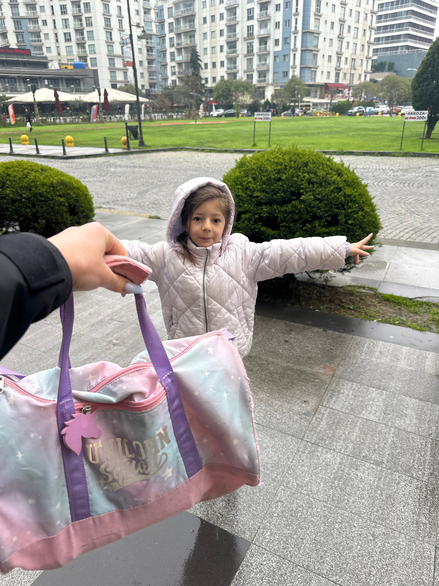 A young girl in a light purple quilted jacket with a hood is standing on a gray tiled surface outside, next to a rounded green bush. She is holding up a "peace" sign with her right hand. A person is hβ¦read more