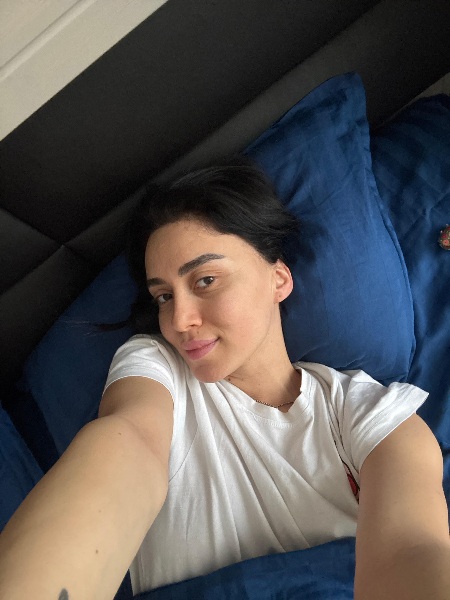 A young adult female is depicted in a selfie, lying on her back in a bed located in Tbilisi, Georgia. She has dark hair and eyebrows, with a light to medium complexion, and is looking directly at theβ¦read more