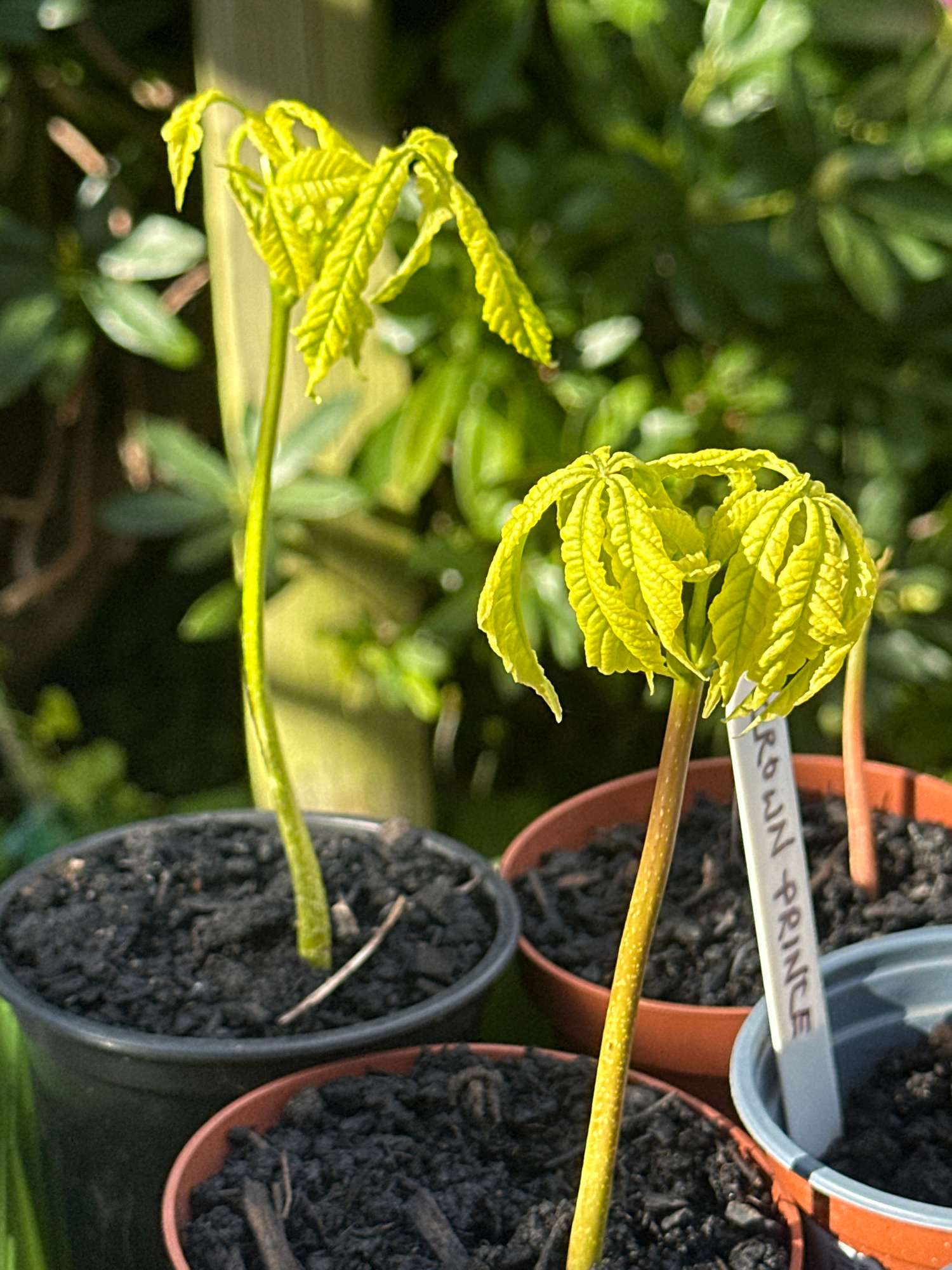 This close-up, outdoor image captures two young plants in small pots, basking in bright sunlight. The photograph is oriented at an angle, with the pots positioned towards the right side of the frame a…read more