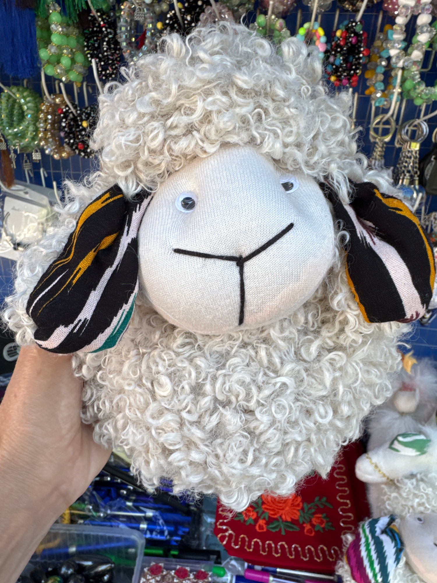 A close-up shot shows a handmade sheep toy, possibly a souvenir, being held up. The toy has a white cloth face with simple stitched features (eyes, nose) and is adorned with curly white wool-like mate…read more