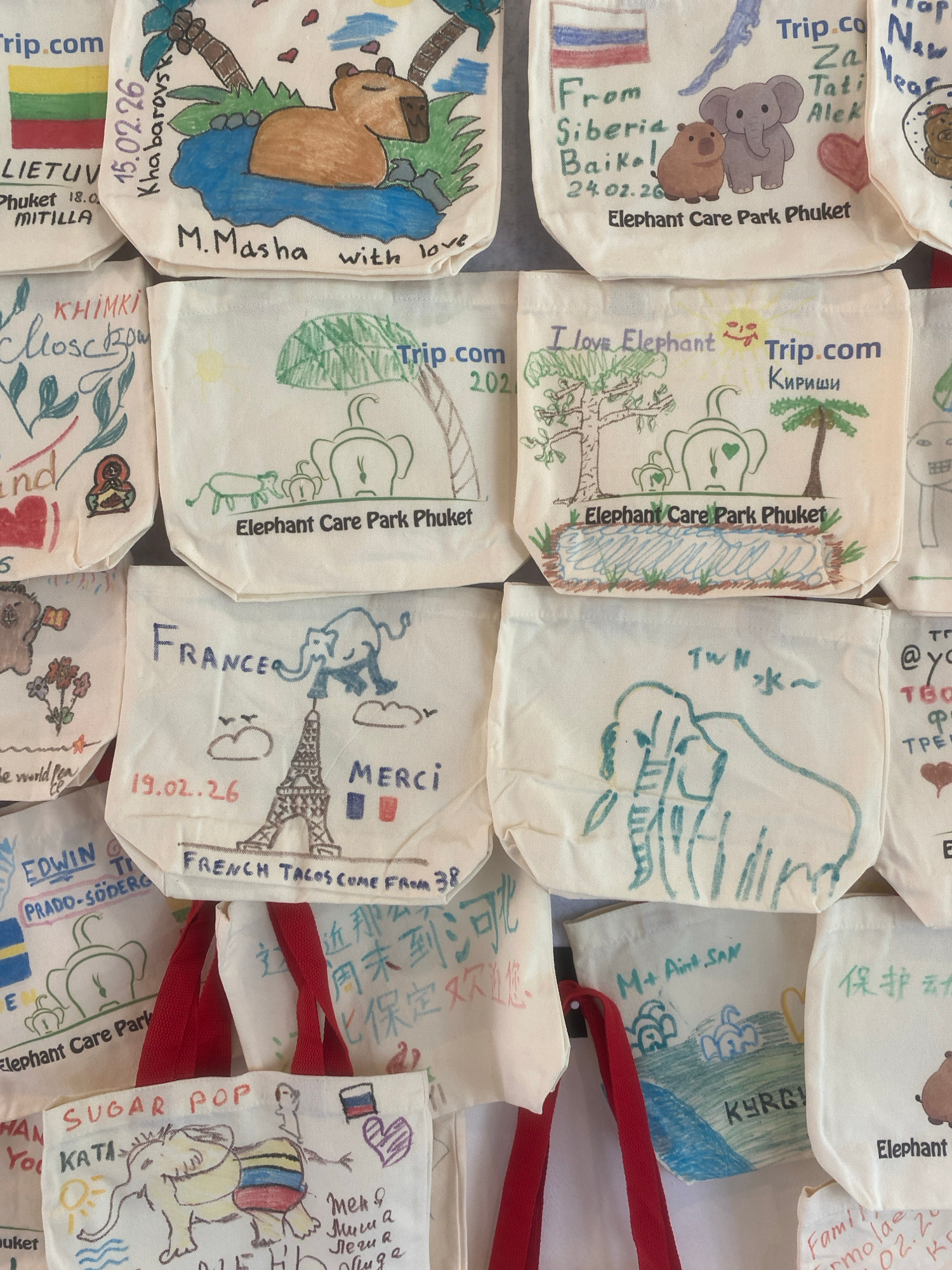 The image displays an overhead view of numerous small, off-white fabric bags, closely arranged and partially overlapping, forming a colorful mosaic of personalized souvenirs. Each bag features unique…read more