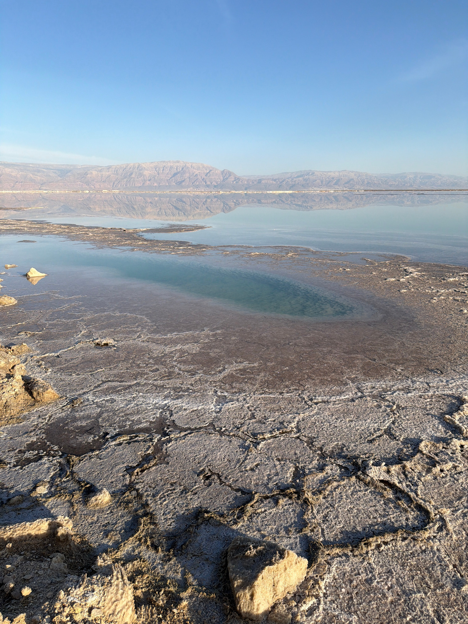 The image depicts a panoramic landscape within the Tamar Regional Council, Israel, under clear daylight. In the foreground, dry, light-brown earth exhibits extensive cracking and is heavily encrusted…read more