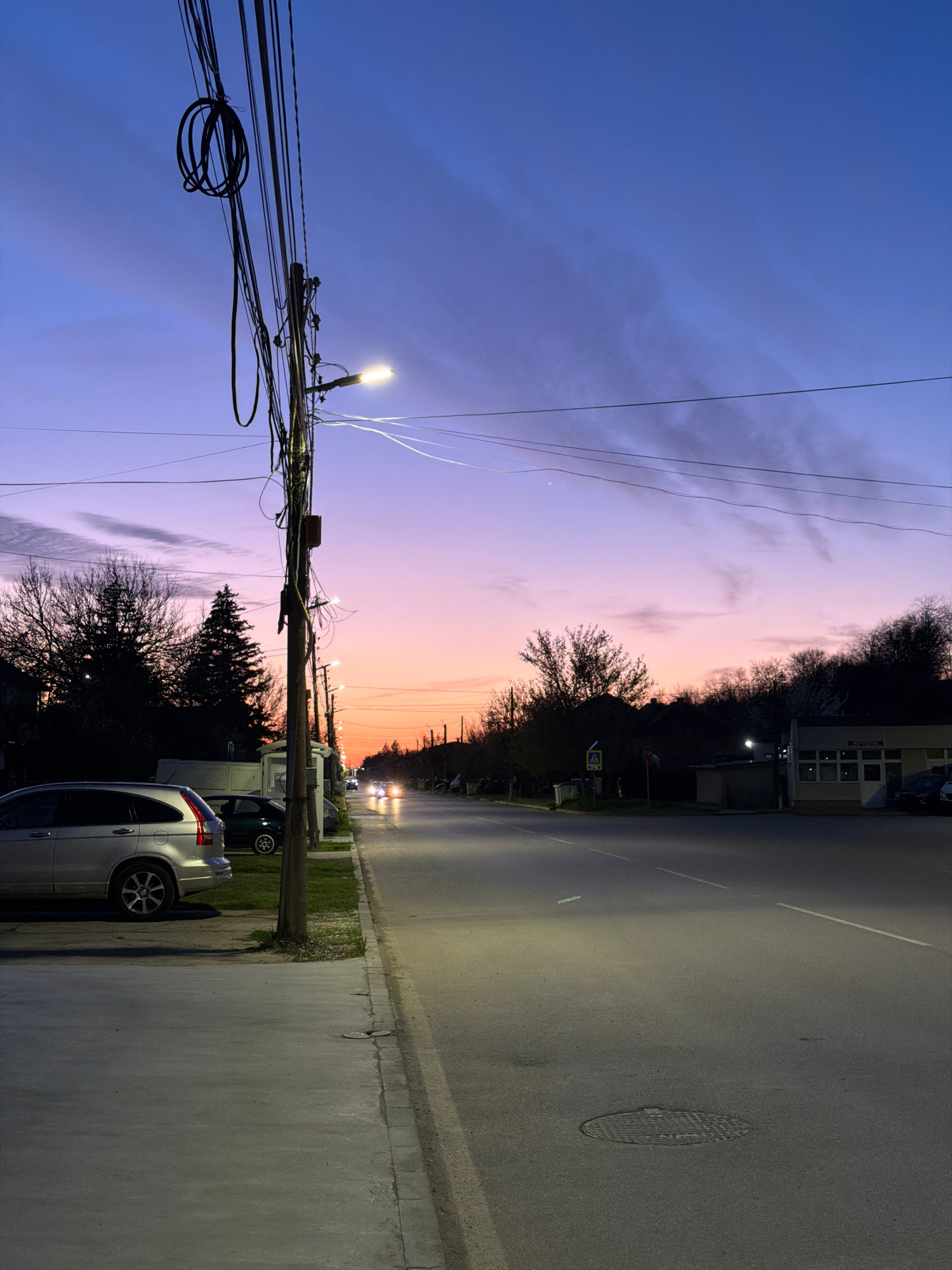 An eye-level perspective image rotated 90 degrees depicts a street scene at dusk in what is presumed to be Kozloduy, Bulgaria. The sky transitions from blue on the left to orange on the right. A power…read more