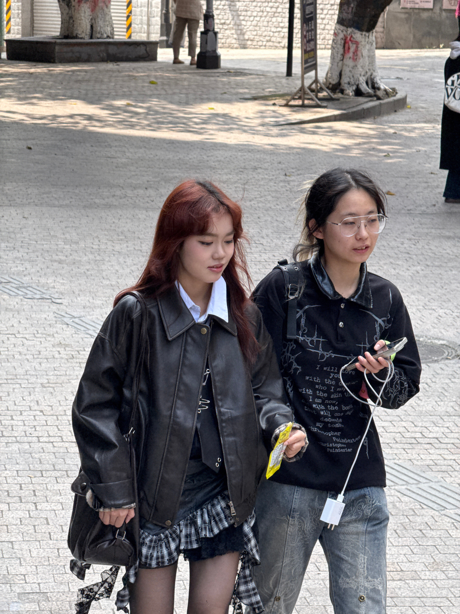 Two young East Asian females walk on a light grey brick-paved surface under daylight in Jiulongpo District, China. The female on the left, with long reddish-brown hair, wears a black leather-look jack…read more