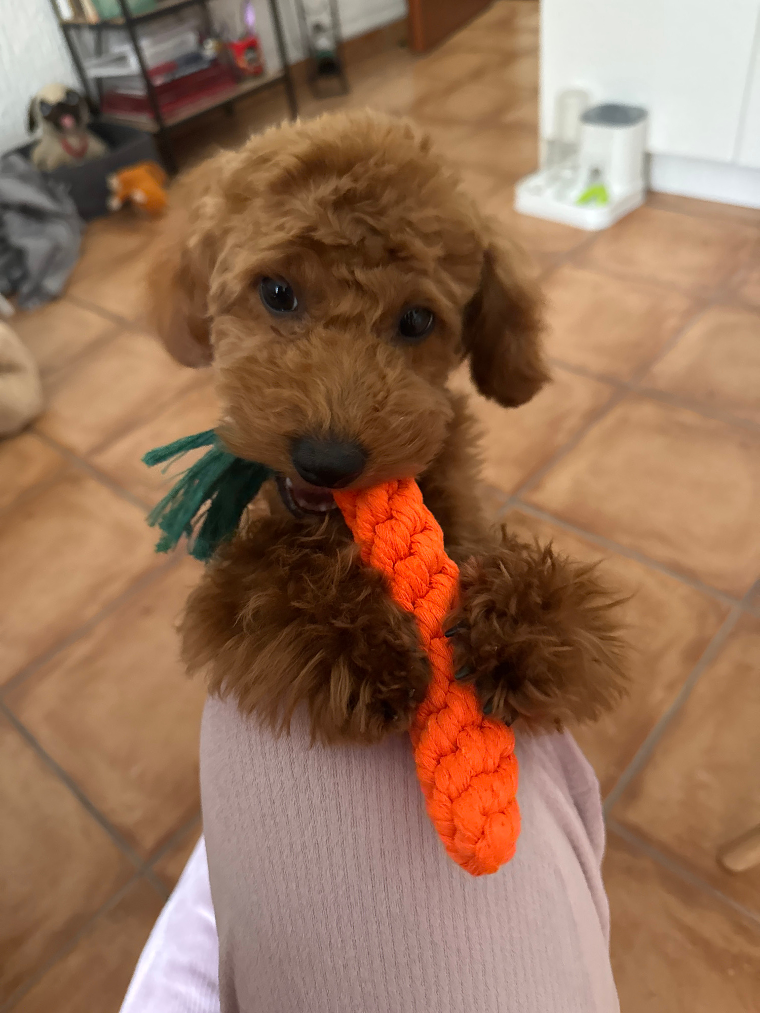 A brown poodle puppy holds an orange and green carrot-shaped rope toy in its mouth. The puppy is close to the camera and slightly tilted. The background shows a tiled floor and part of a light-colored…read more