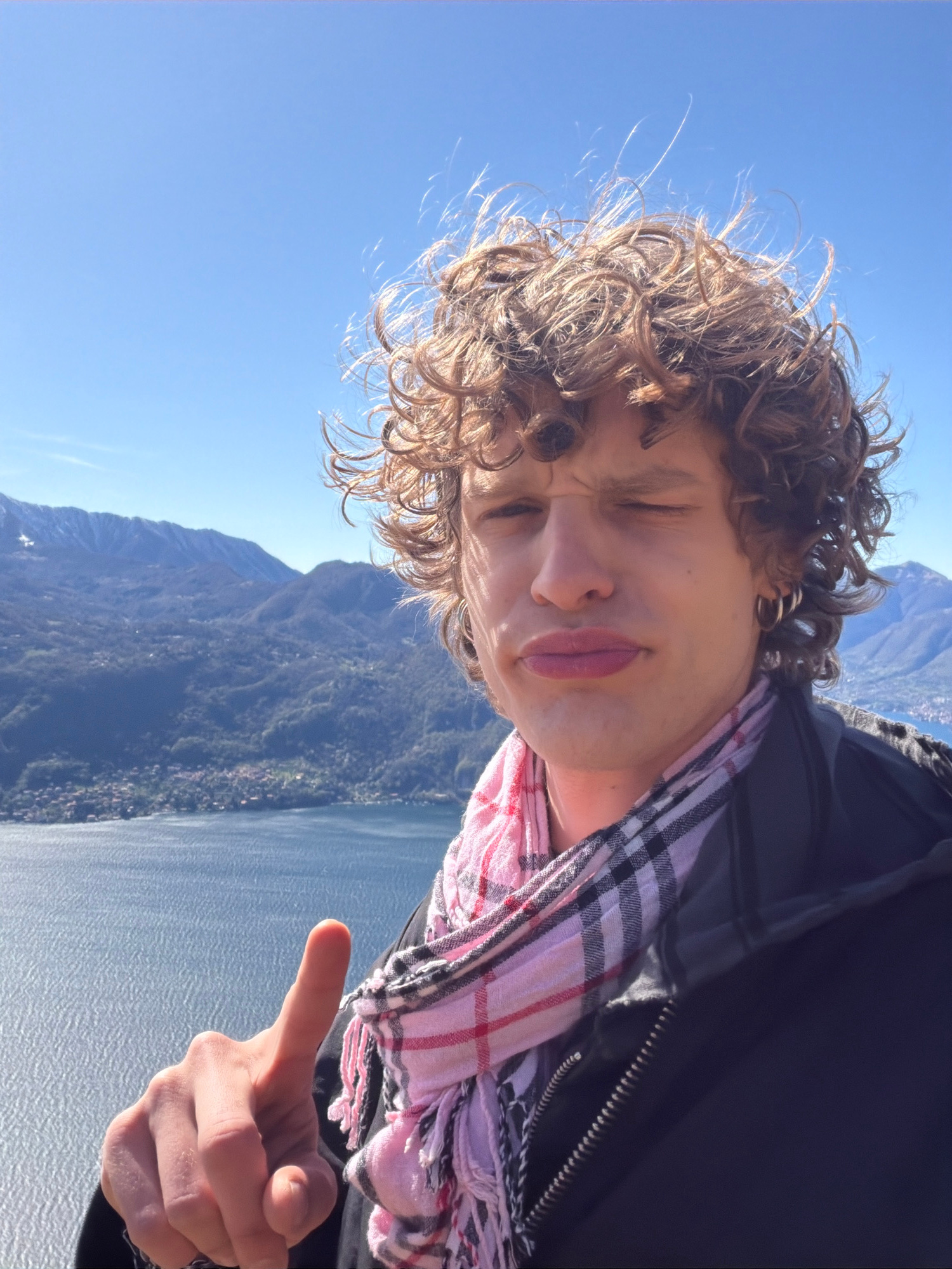 A fair-skinned individual with curly brown hair is positioned in the foreground, wearing a black jacket and a pink and white plaid scarf. Their eyes are squinted and lips slightly pursed. The individu…read more