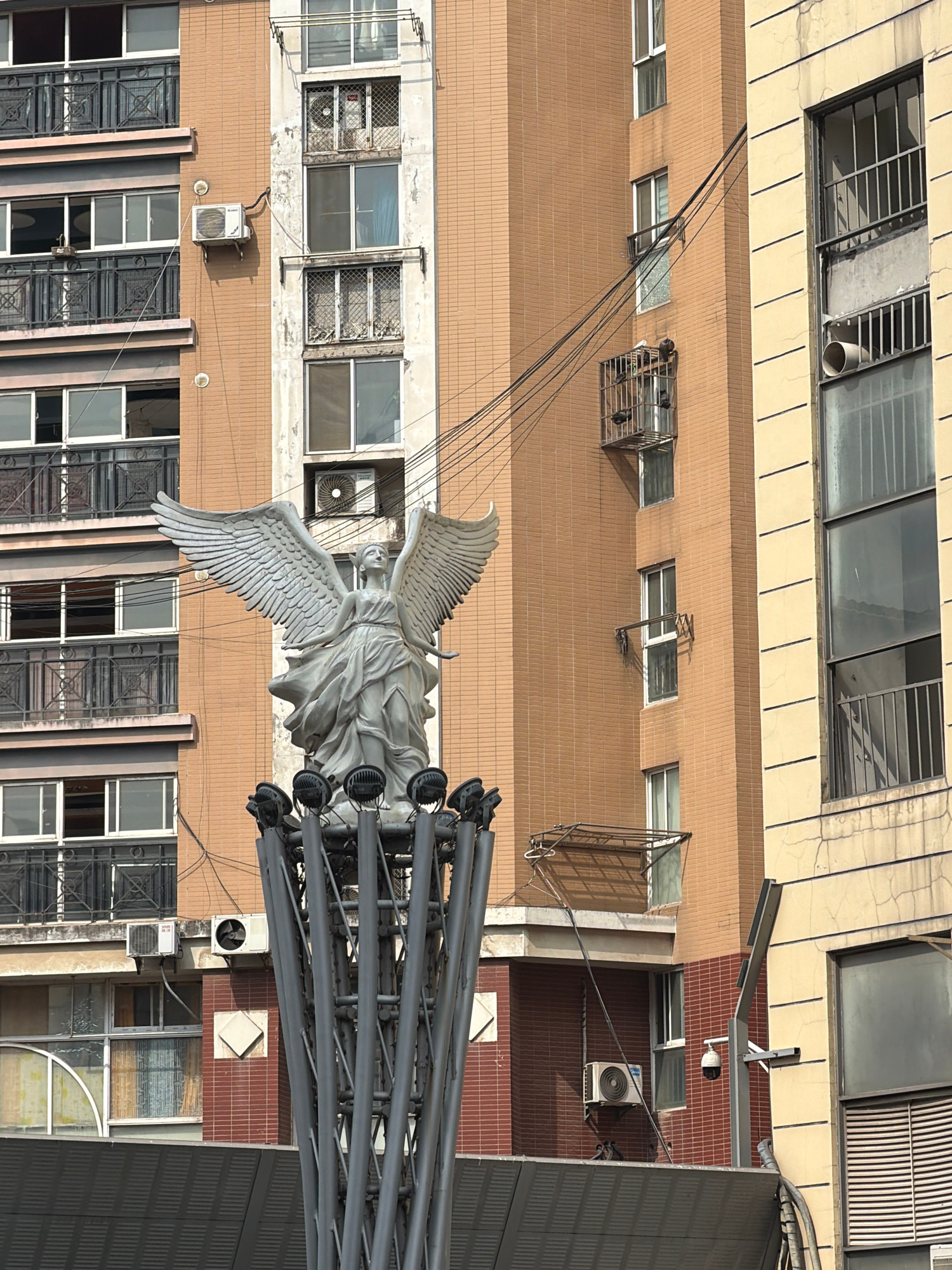 An aerial shot shows a statue of an angel with large wings near the top of a tall metal lighting structure against a backdrop of multi-story buildings in Jiangning District, China. The buildings featu…read more