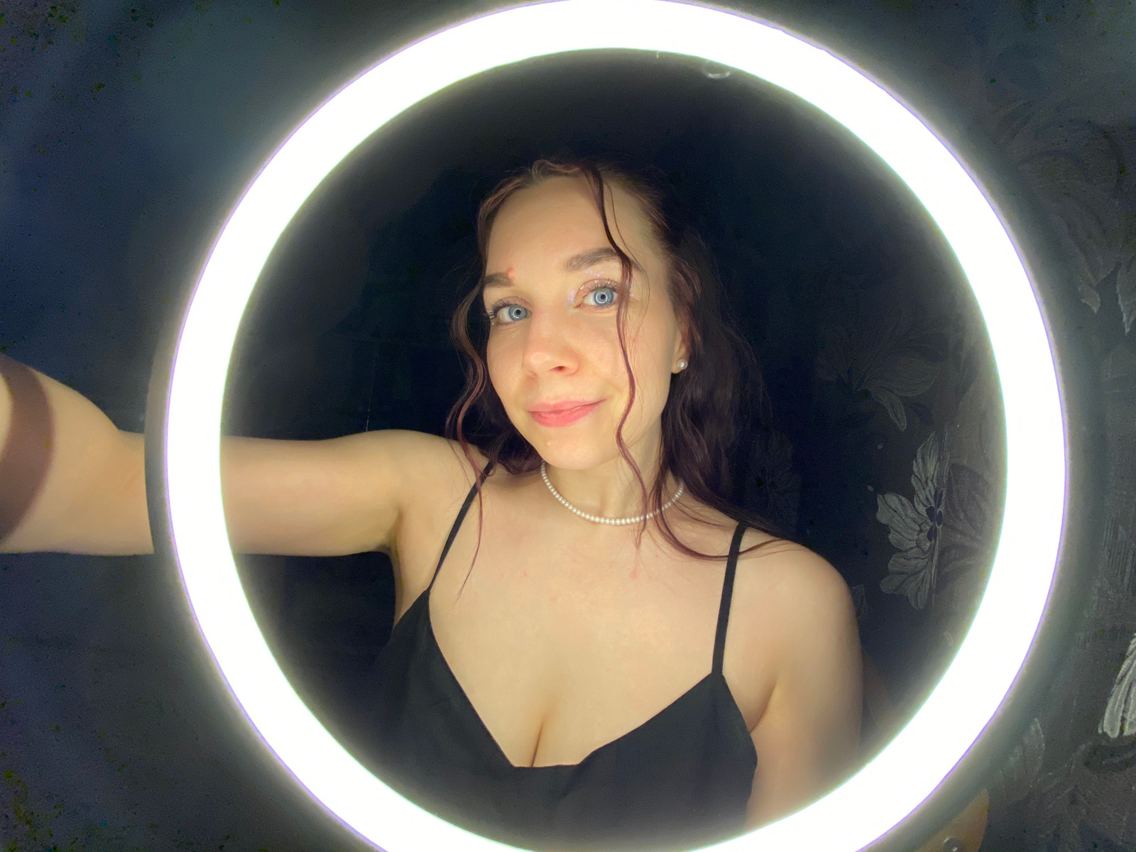 A woman with blue eyes, brown hair, and fair skin is centrally framed within a bright white ring light. She is wearing a black top with thin straps and a pearl necklace. Her face is slightly tilted up…read more