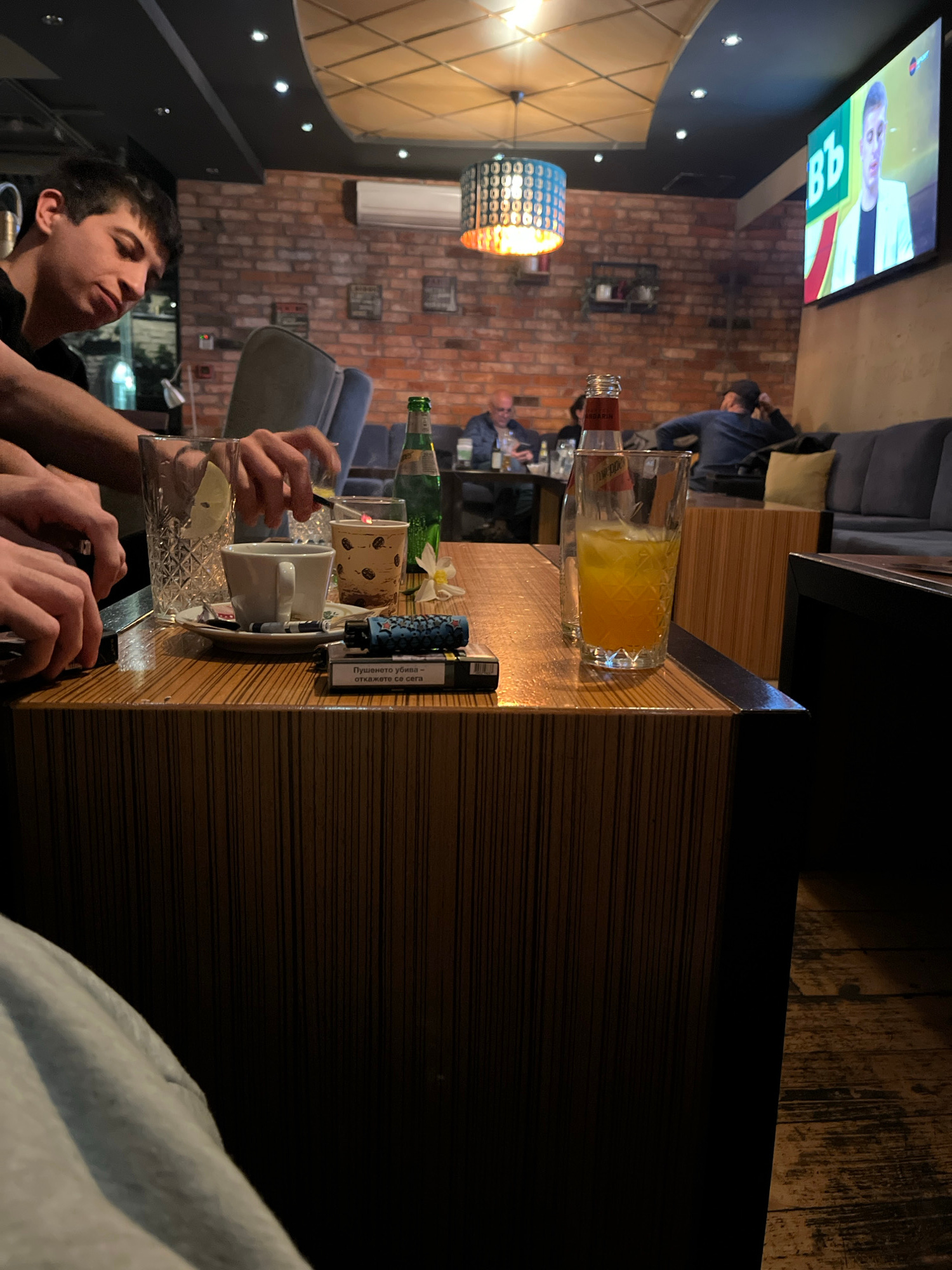 The image shows a bar in Karlovo, Bulgaria. A young man is shown in the foreground, seemingly engaged in assembling or using a device. On the bar, there are several drinks, including a glass with a le…read more