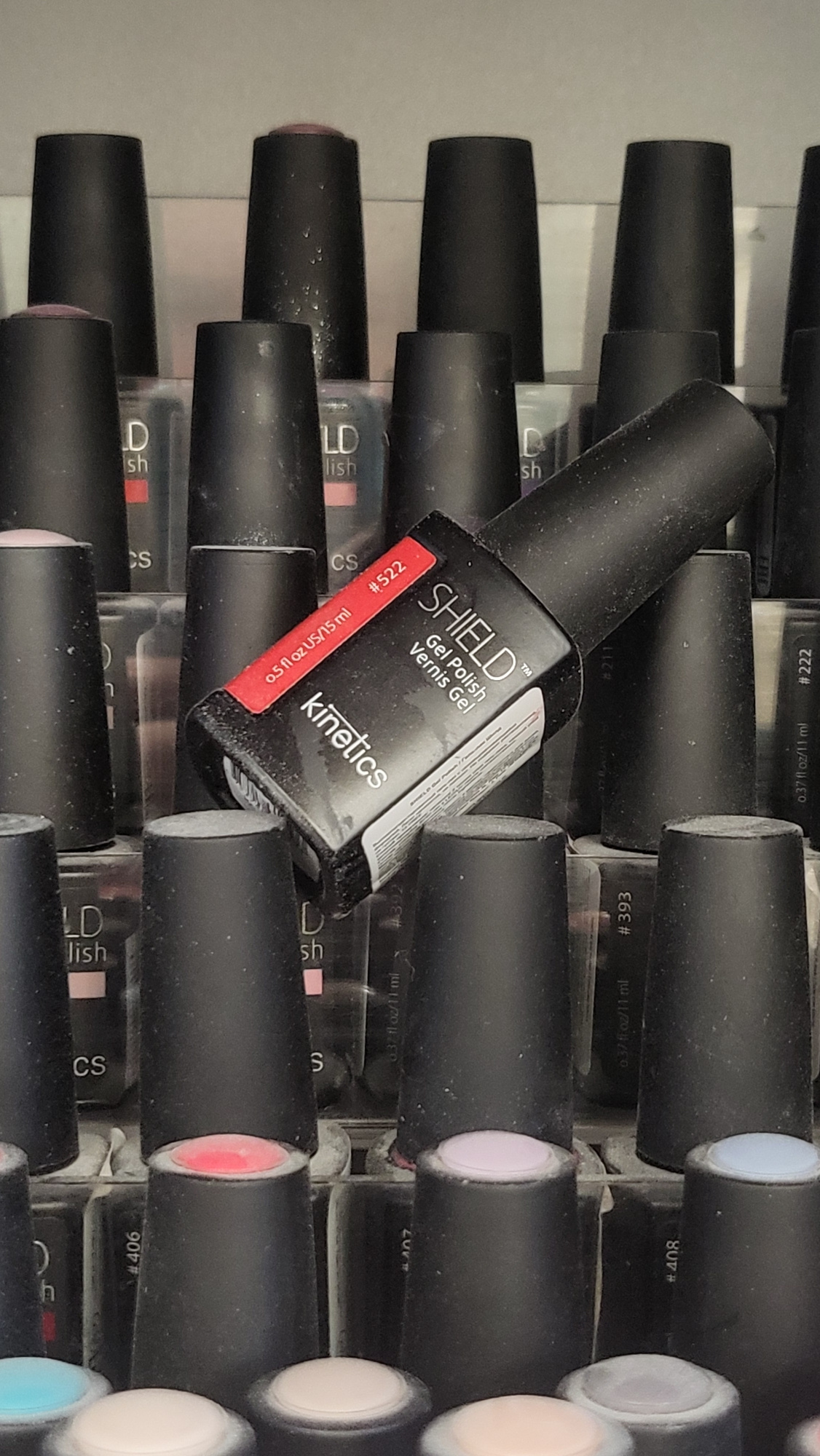 The image displays a close-up, overhead view of numerous nail polish bottles, predominantly featuring black caps and clear glass bodies, organized within a rack or display unit. One bottle is lying di…read more