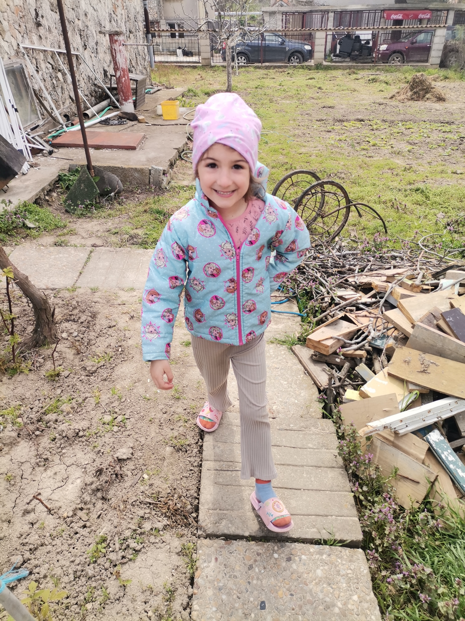 A young girl is the primary subject, smiling while standing on concrete steps in what appears to be a backyard. The background shows an unkempt area with scattered wood, metal wheels, and general debr…read more