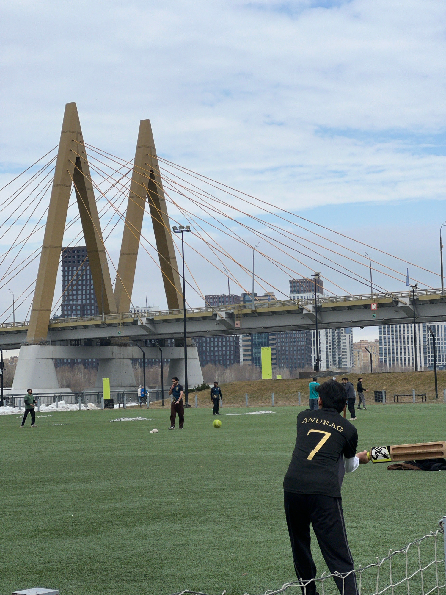 The image depicts a soccer field in Kazan, Russia, with the Millennium Bridge in the background. Several people are playing or watching the game. A person wearing a black shirt with the name "ANURAG"…read more