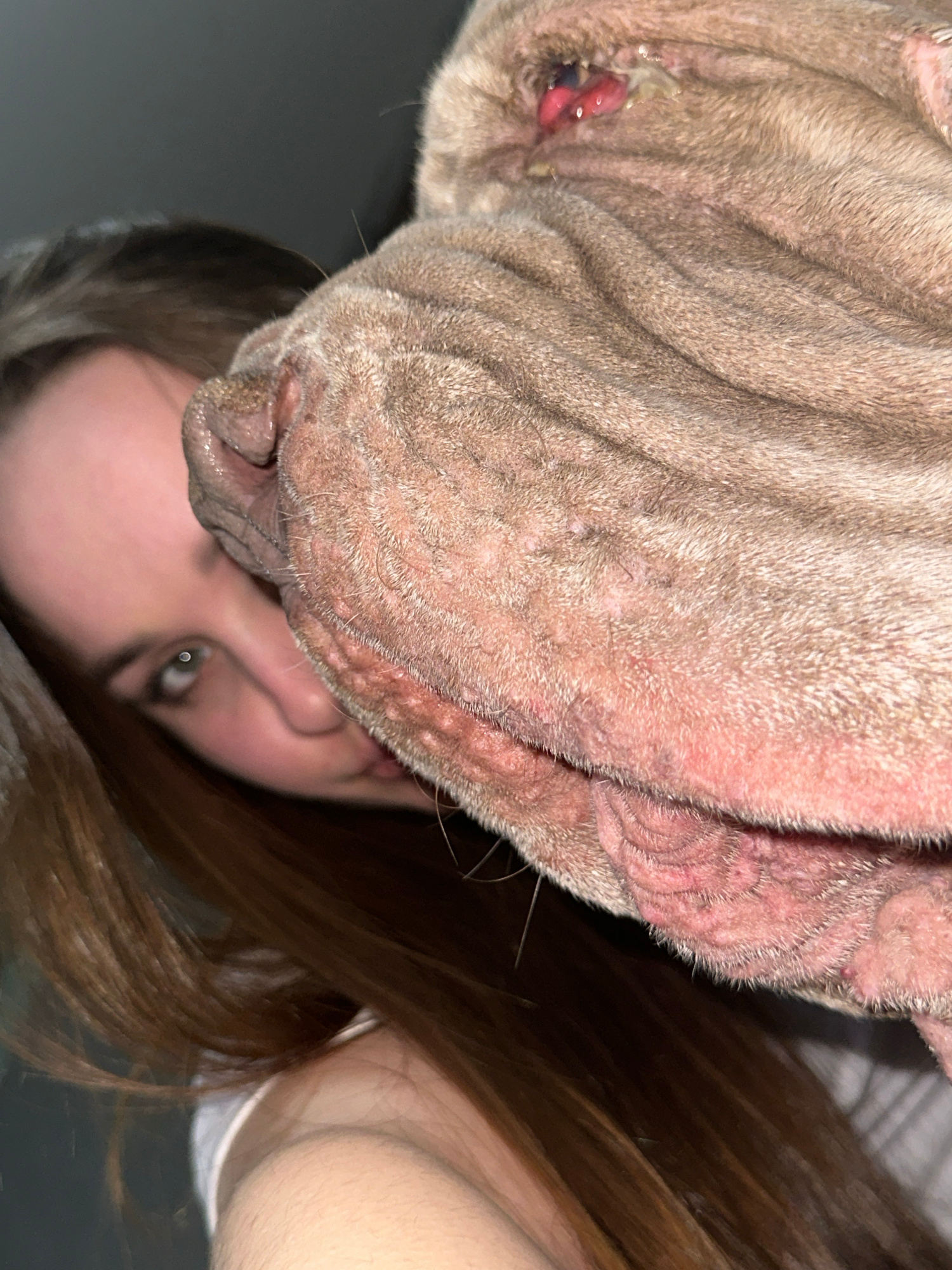 An extreme close-up, low-angle shot captures the faces of a person and a heavily wrinkled dog, likely a Shar Pei. The dog's light brown, short-haired, and deeply folded skin dominates the upper and le…read more