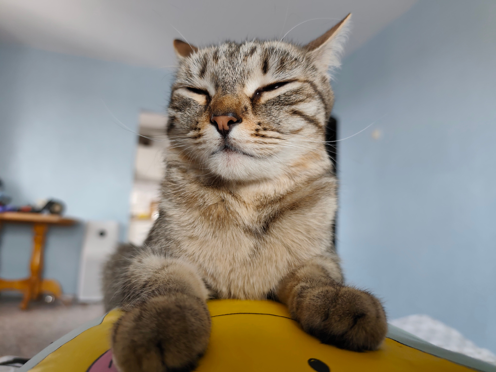 A close-up, low-angle photograph captures a tabby cat with striped brown, grey, and black fur, resting indoors in Chaikovsky, Russia. The cat's eyes are closed or heavily squinted, conveying a strong…read more