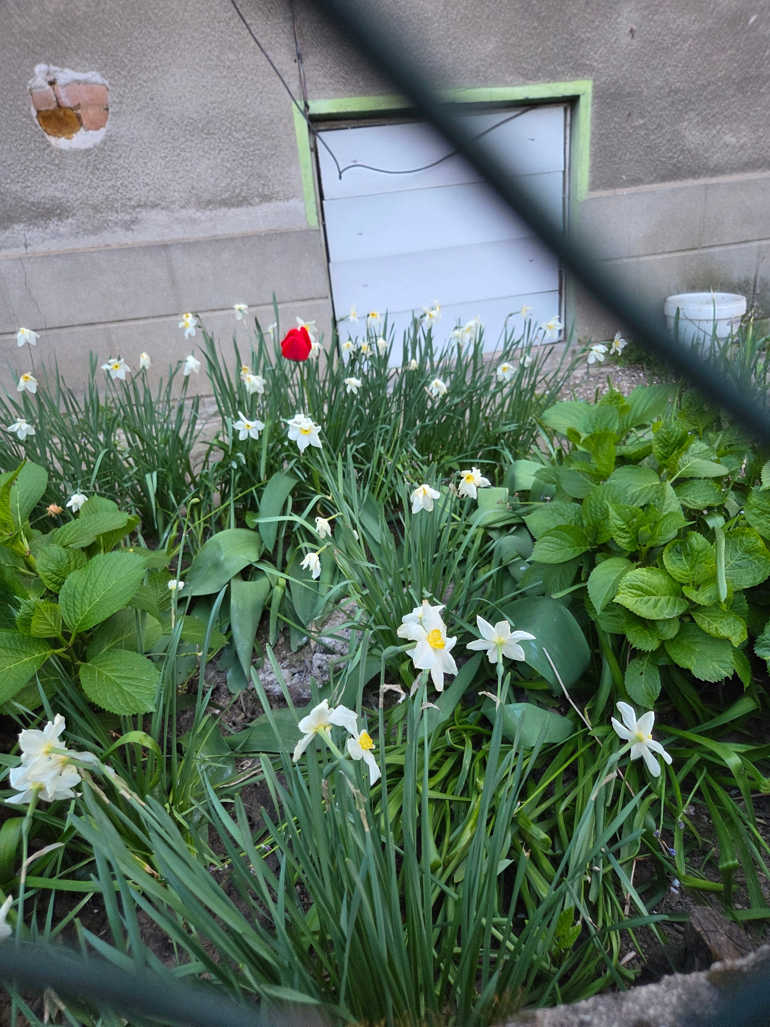 An outdoor garden scene is captured from a slightly elevated and tilted perspective, partially obscured by a dark fence or railing running diagonally across the frame. The dominant feature is a lush g…read more