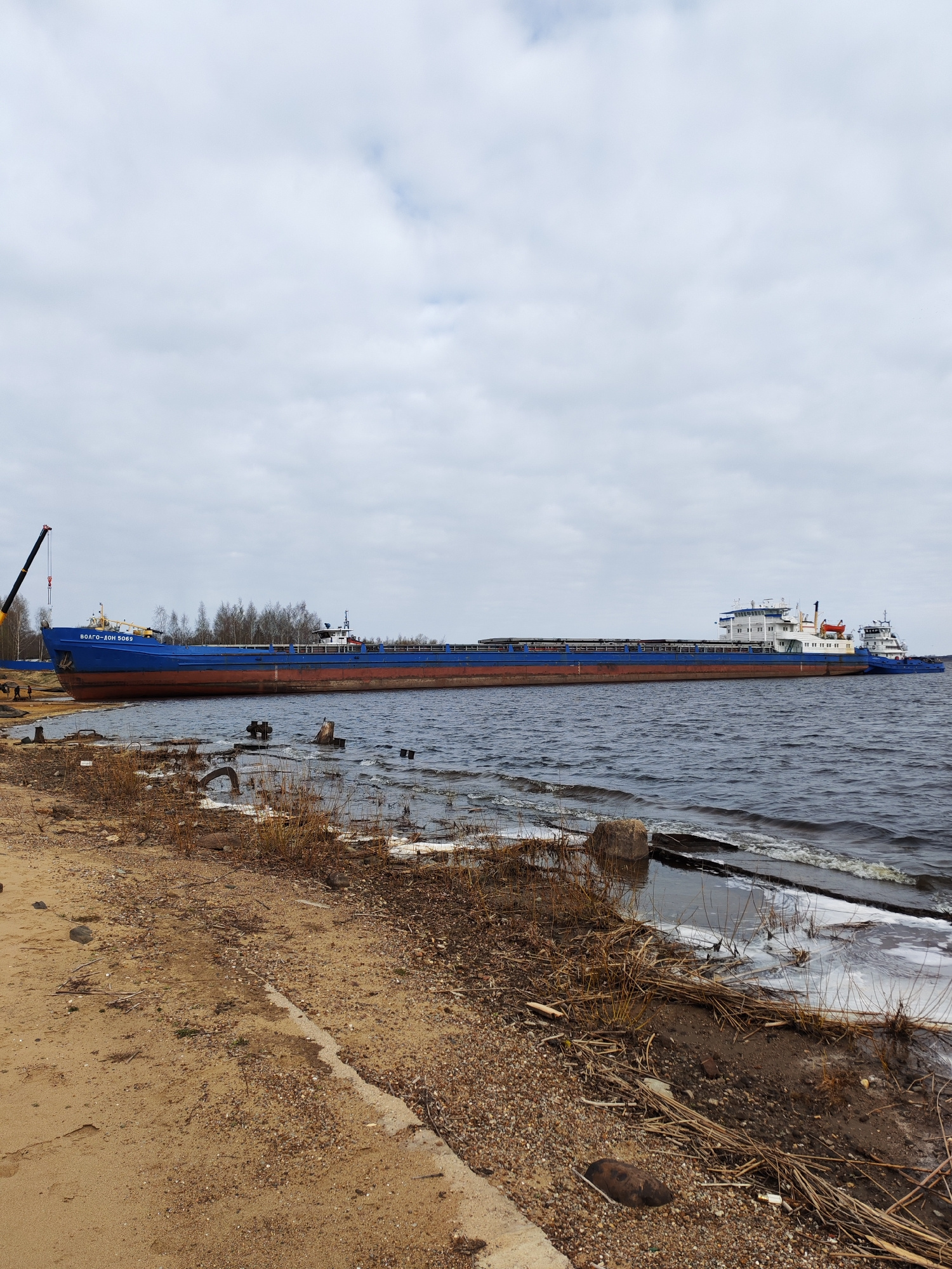 The image depicts a large blue and red cargo ship, labeled "ВОЛГО-ДОН 5069" on the bow, partially beached near the shore of the Volga River in the city of Rybinsk, Russia. A crane is visible on the le…read more