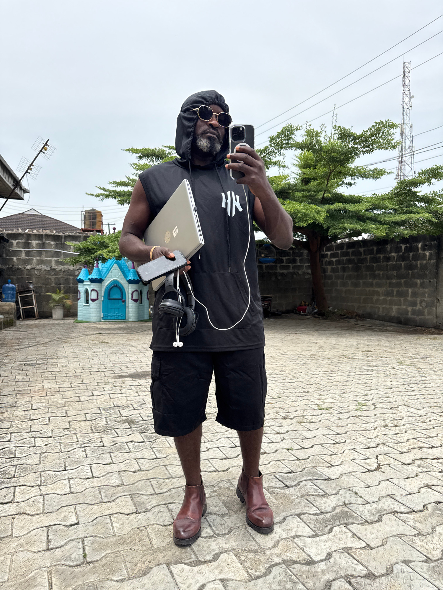 An outdoor, full-body selfie shows a dark-skinned man standing on a paved surface. He is wearing a black hooded top with the hood up, black shorts, dark brown leather boots, and dark sunglasses. A whi…read more