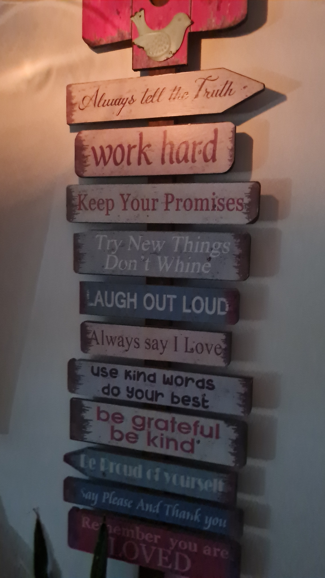 The image depicts a collection of wooden signs arranged horizontally against a plain, off-white background. The signs vary in shape, size, and color, and each displays a motivational message in stylizβ¦read more