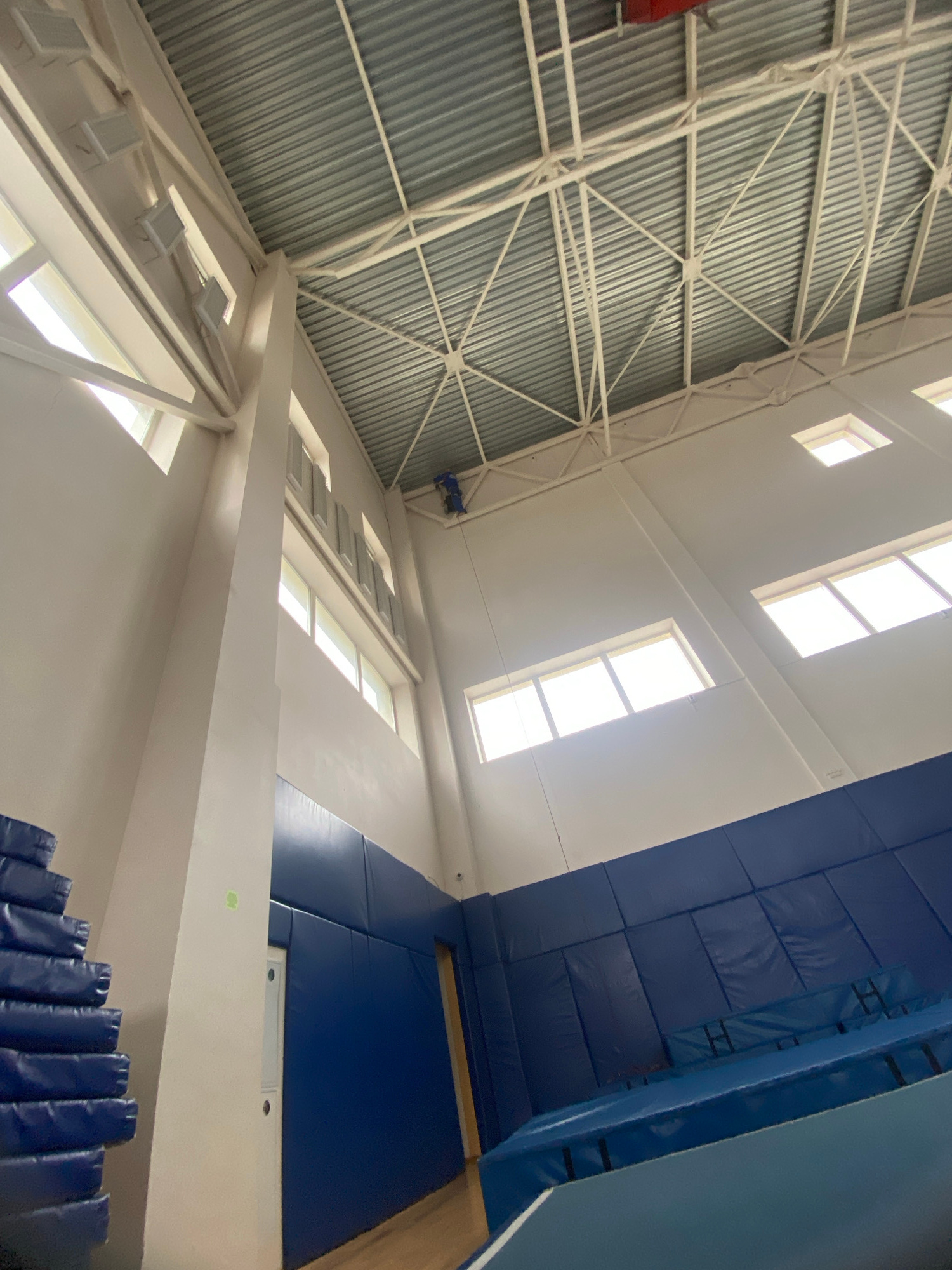 The image depicts an interior space, likely a gymnasium or large sports hall. The scene is viewed from a low angle, looking upwards. Ceiling: The ceiling structure is prominently visible, featuring a complex network of white metal beams and a corrugated metal roof. Windows: A series of windows are positioned along the upper walls, allowing natural light to enter the space. Wall padding: On one side of the image, blue padding covers a portion of the wall. Location: There is no information to confirm the location is in the city of Прикамский, Russia. | Open Wire
