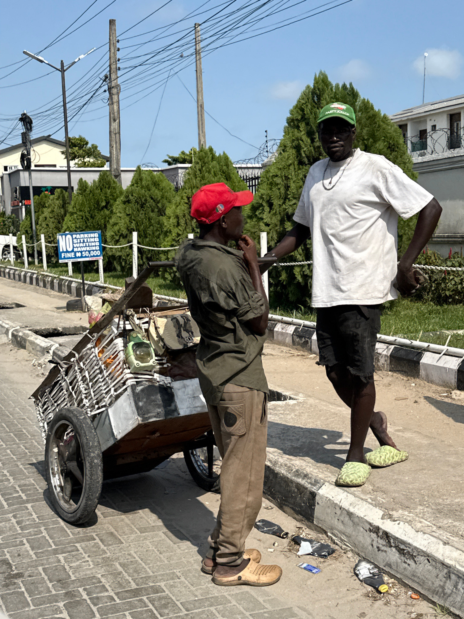 The image captures a street scene in Ojomu, Nigeria, featuring two men standing next to a wheeled cart. One man, wearing a white t-shirt, black shorts, and a green cap, stands with his hand on his hip…read more