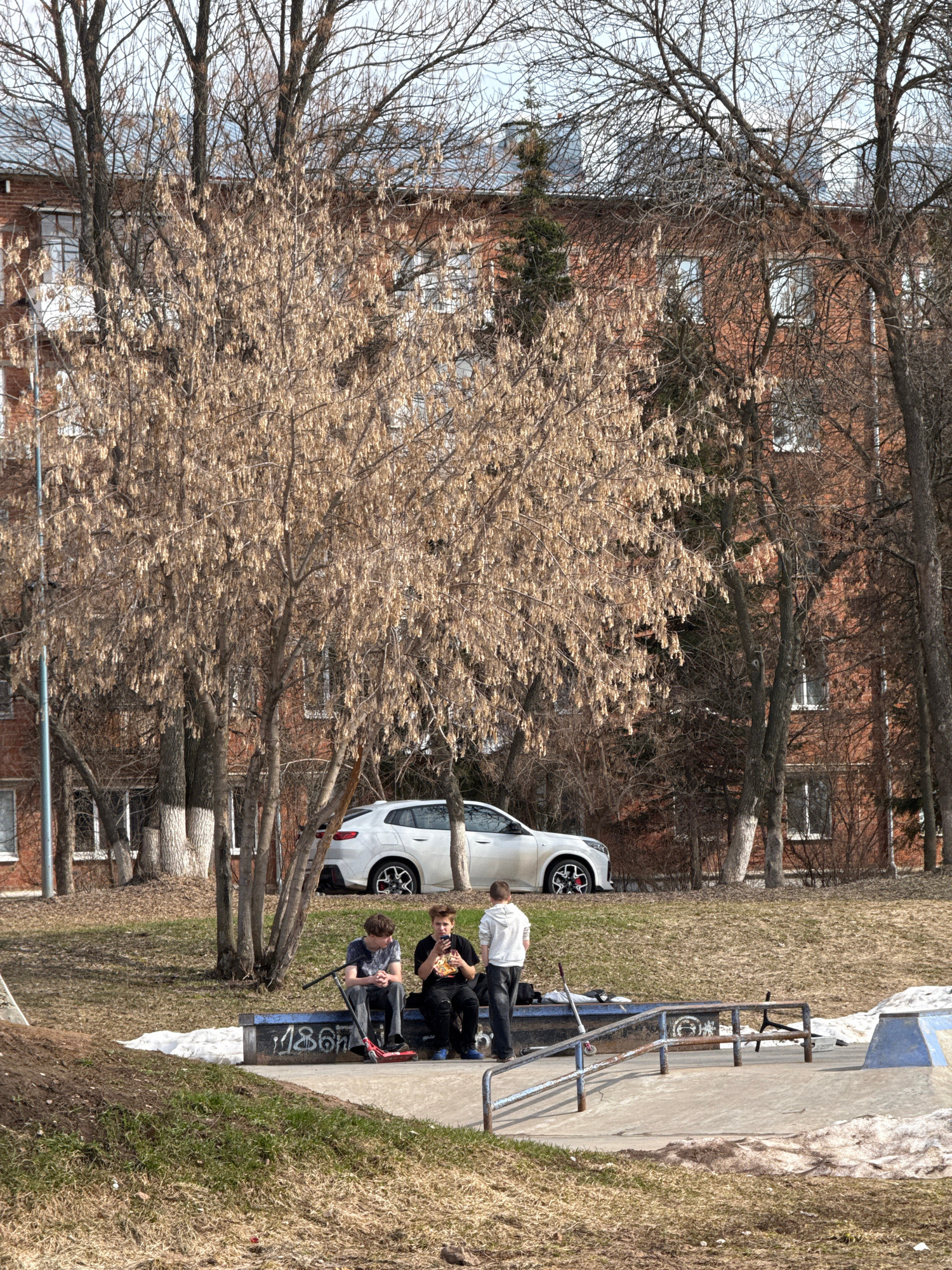 The image depicts an outdoor scene. In the background, a brick building with multiple windows is visible, partially obscured by bare trees. A white car is parked near the curb. In the foreground, thrβ¦read more
