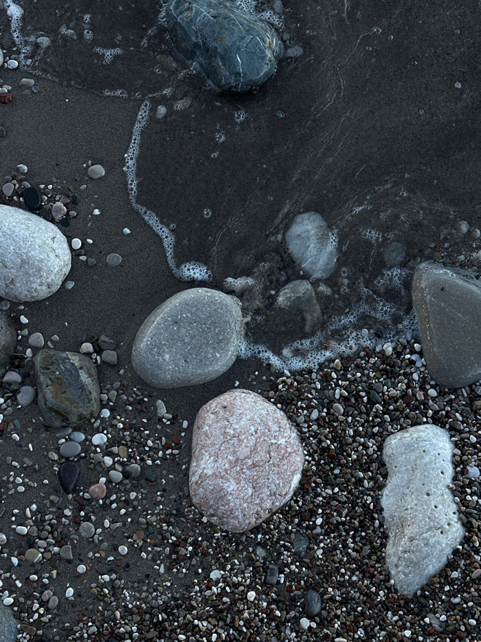 This image presents an overhead, close-up view of a pebbly beach at the water's edge in Bar, Montenegro. The scene is dominated by dark, wet sand intermixed with a dense collection of small, multi-col…read more