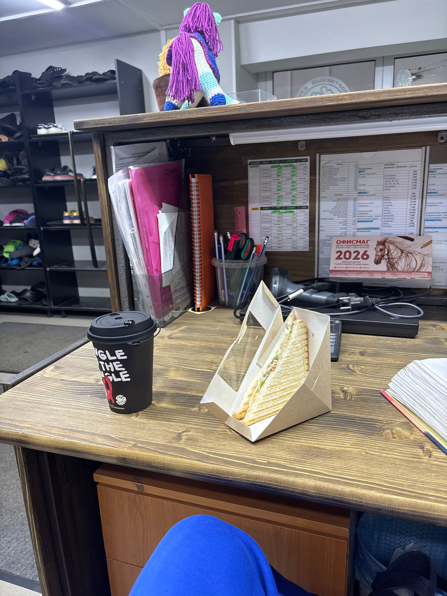 The image shows a desk in Perm, Russia. On the desk are a calendar marked with "2026", a sandwich in a cardboard container, a cup of coffee, a pen holder filled with pens, a notepad, and some paperwor…read more