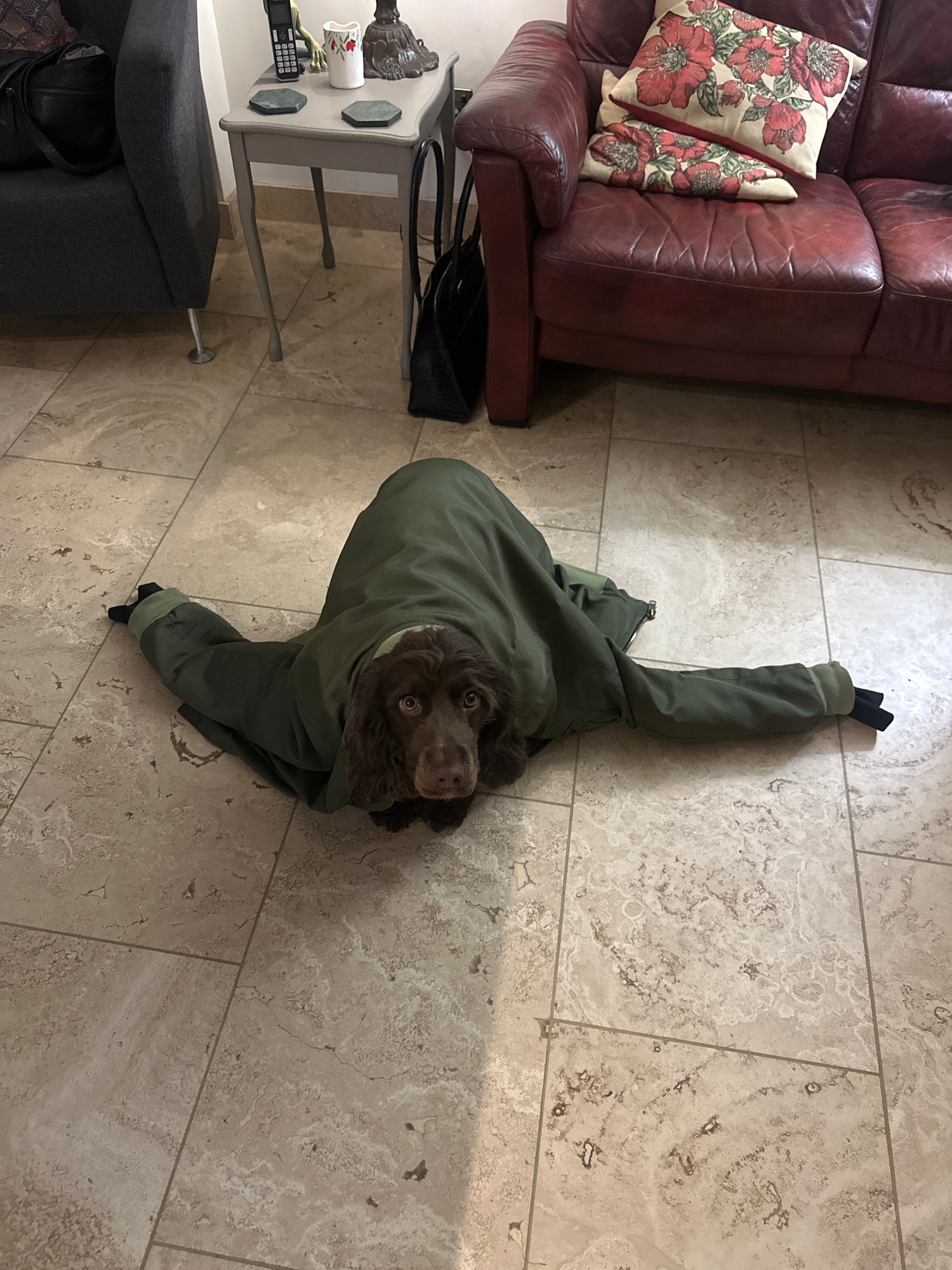 A medium-sized, brown, curly-haired dog is lying on its back on a tiled floor, wearing an olive-green jacket. The jacket appears to be zipped up around the dog, with its arms sticking out of the sleev…read more