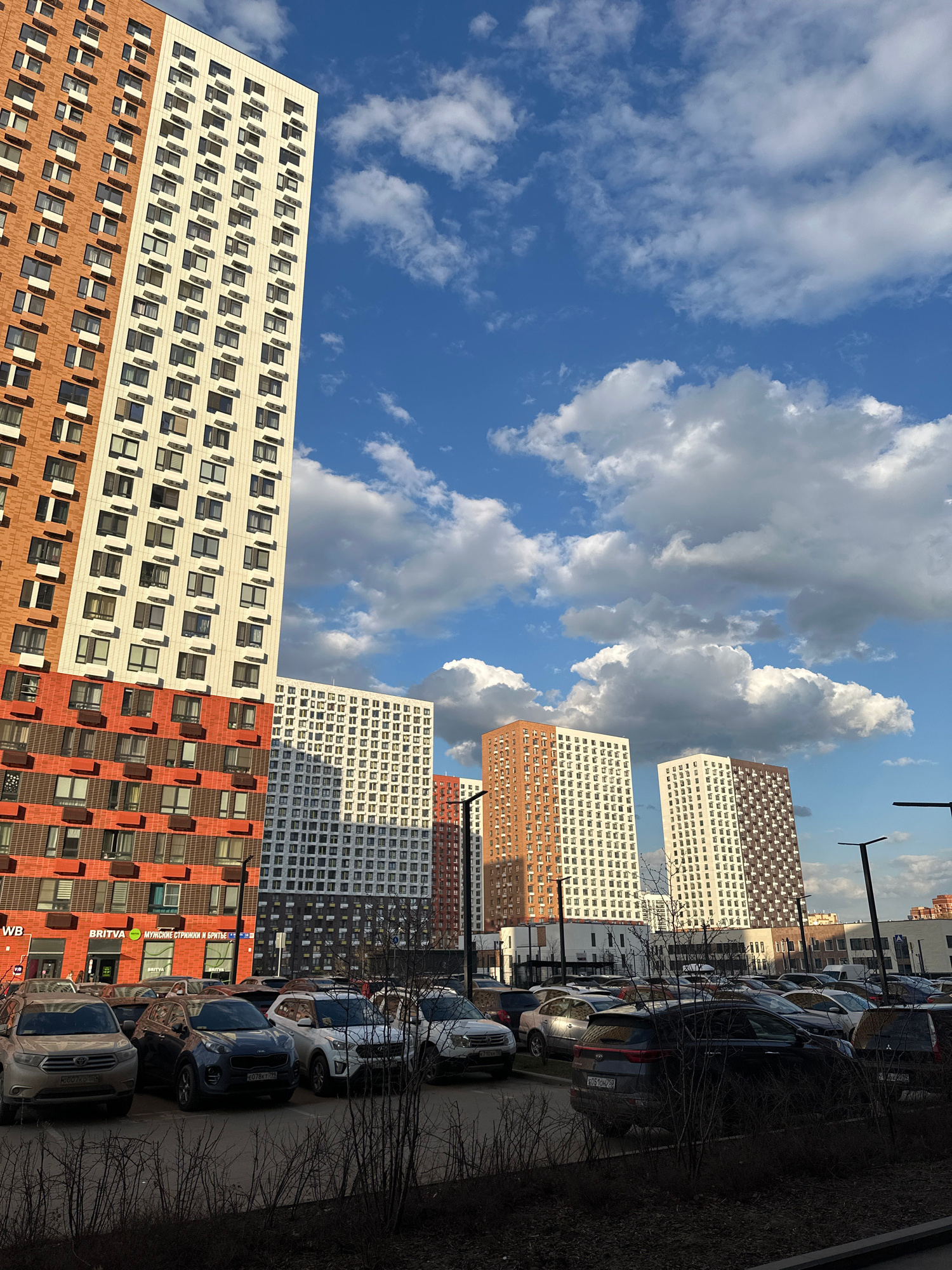 The image shows a view in Lyubertsy, Russia, dominated by modern architecture under a sky filled with cumulus clouds. Several high-rise residential buildings are visible, characterized by alternating…read more
