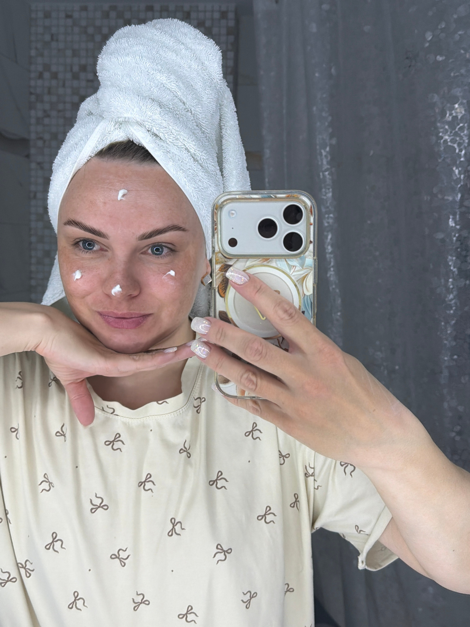 A woman with a towel wrapped around her head is taking a selfie in what appears to be a bathroom. She has dots of white cream on her face. She is holding her phone, which has a decorative case, and po…read more
