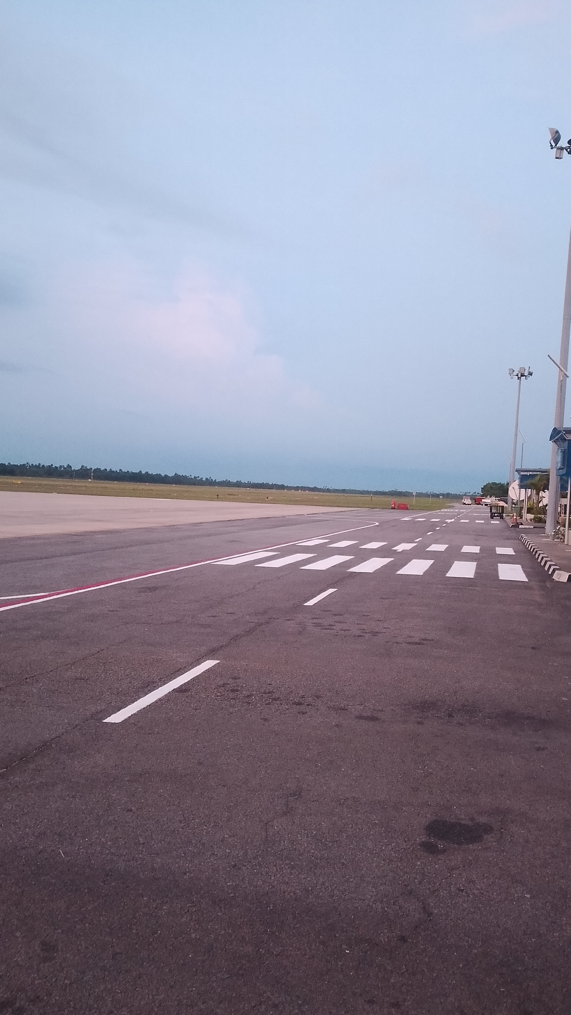 The image shows an airfield in Orerokpe, Nigeria. The runway is made of asphalt and has white markings. There are also some buildings and trees in the background. The sky is cloudy.