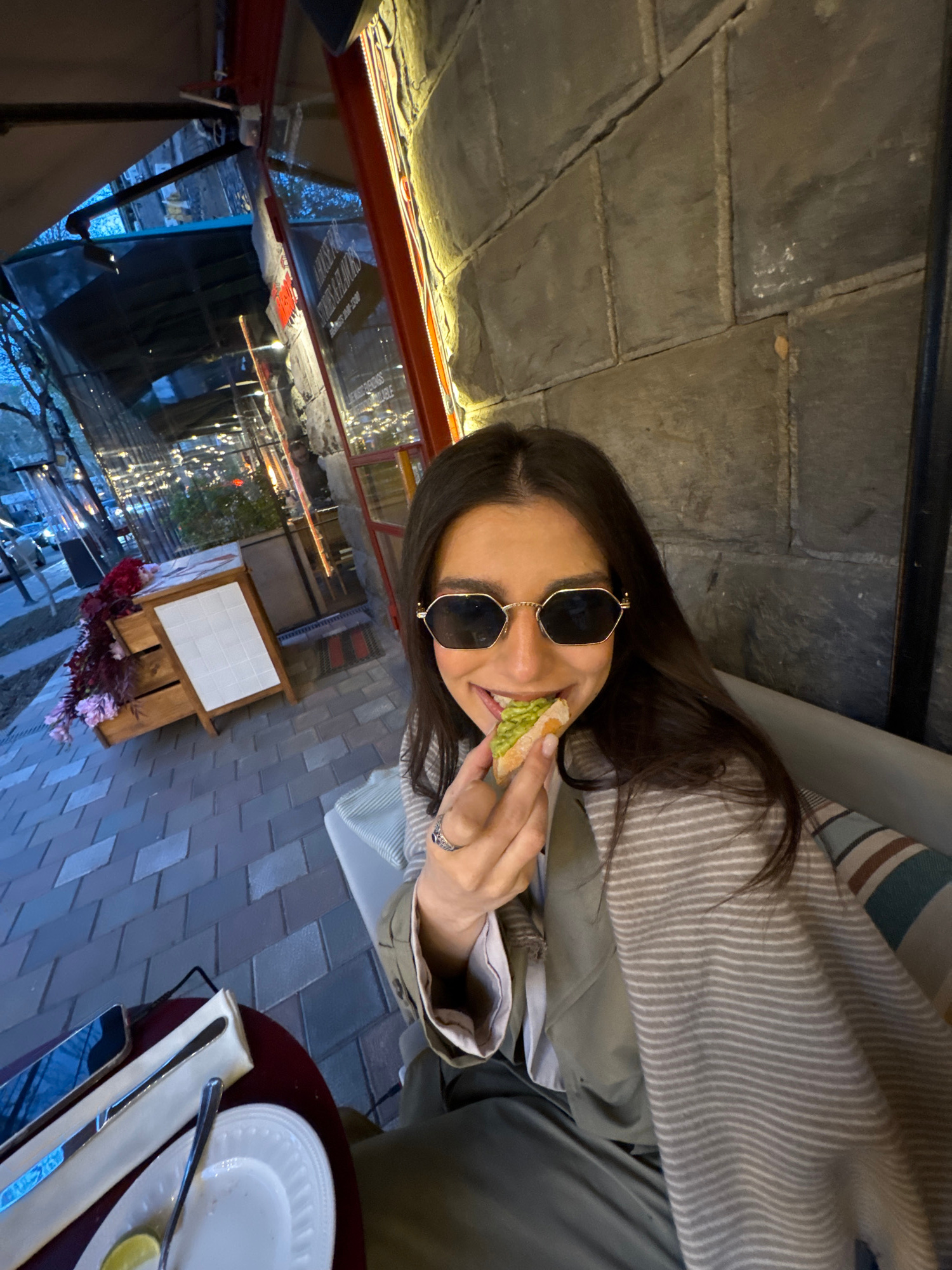 The image depicts a woman with long brown hair and sunglasses seated outdoors at a restaurant, possibly in Yerevan, Armenia. She is eating a sandwich. A table with cutlery and a plate is visible, alonβ¦read more