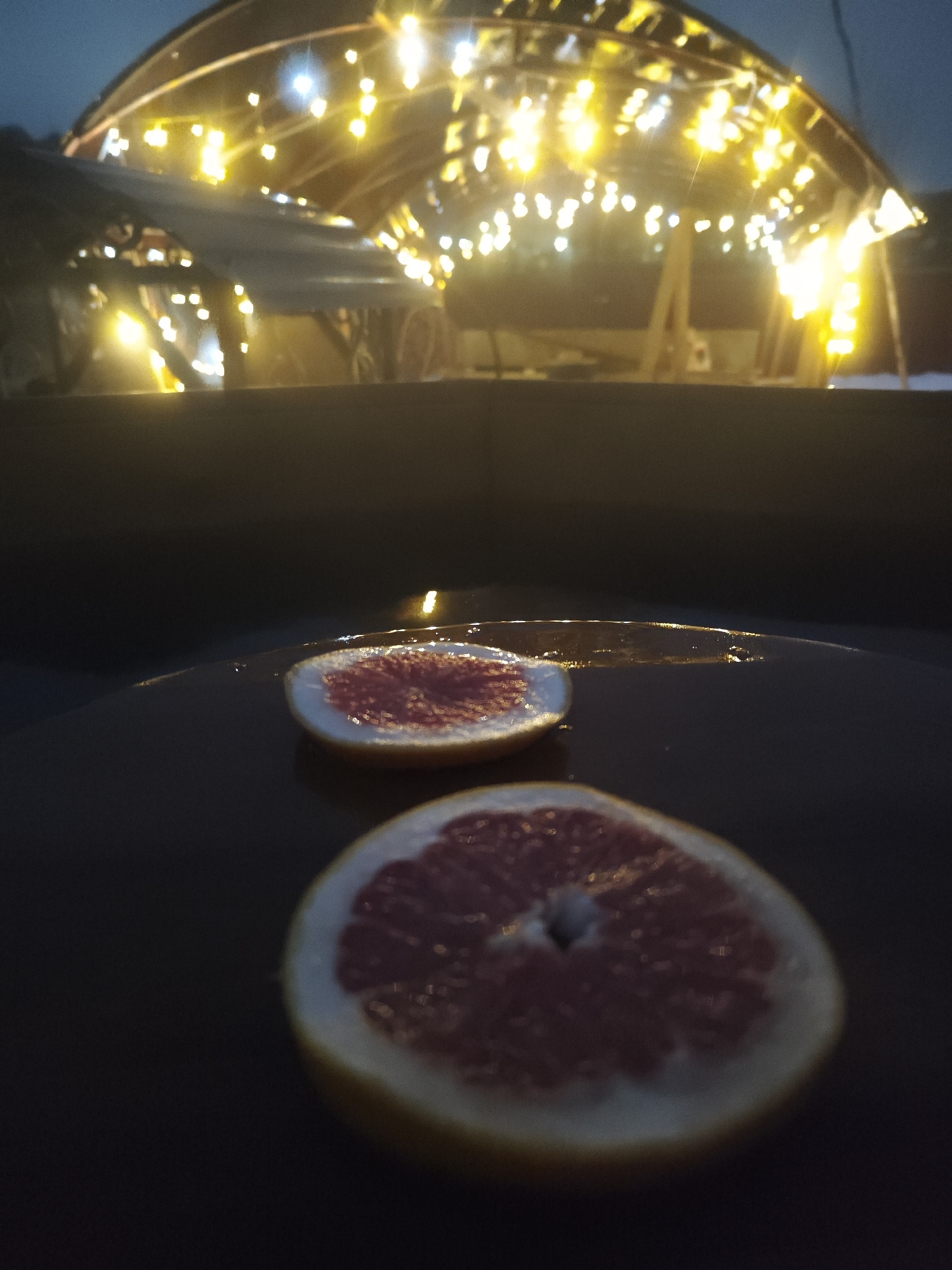 The image depicts two grapefruit slices on a dark, reflective surface, likely a wet table or ledge. In the background, out of focus, is a structure illuminated with string lights, possibly a gazebo or…read more