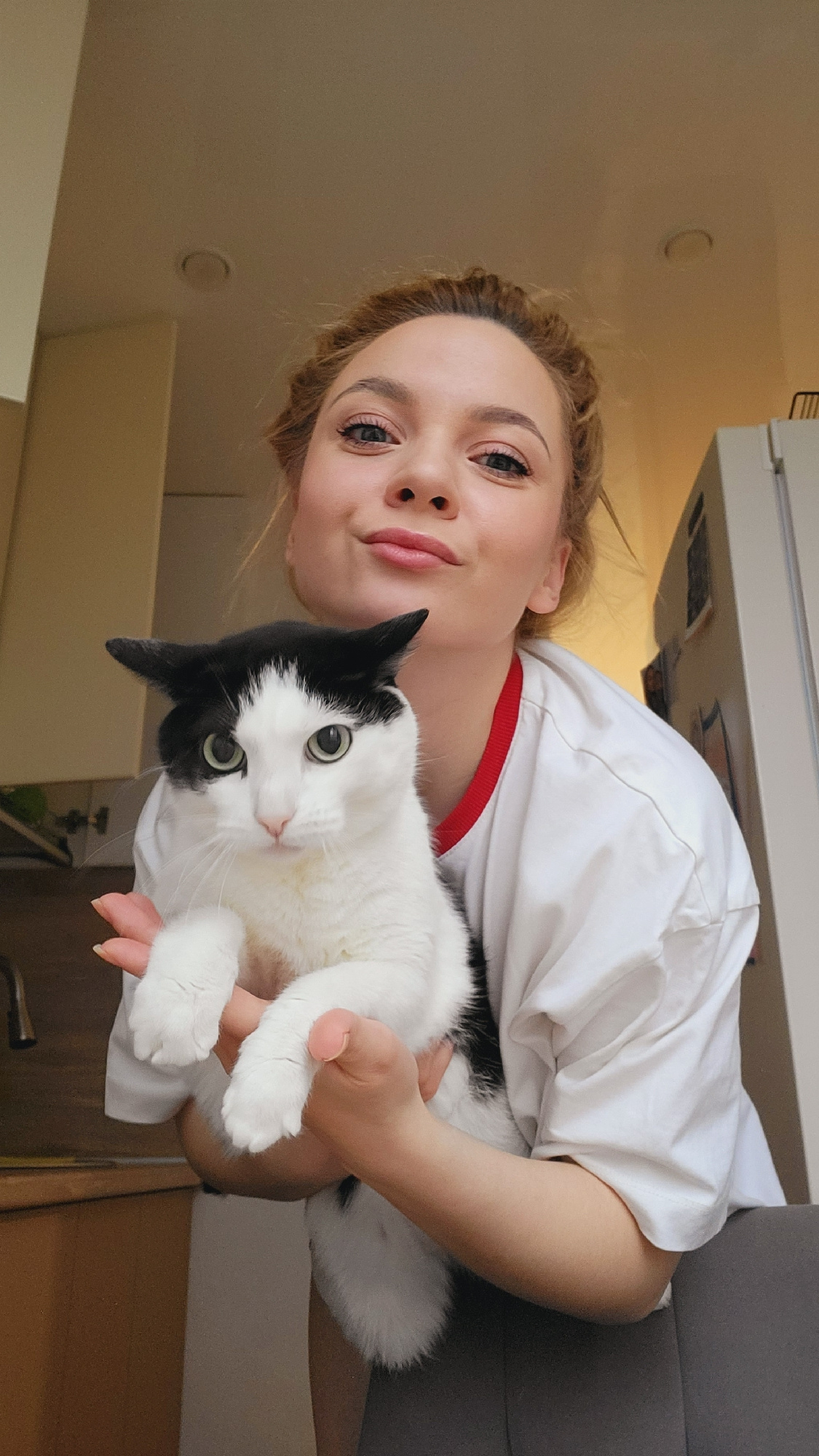 A woman holds a black and white cat in an indoor environment. The woman has fair skin, blonde hair, and is wearing a white shirt with red trim around the collar. She is looking toward the camera. The…read more