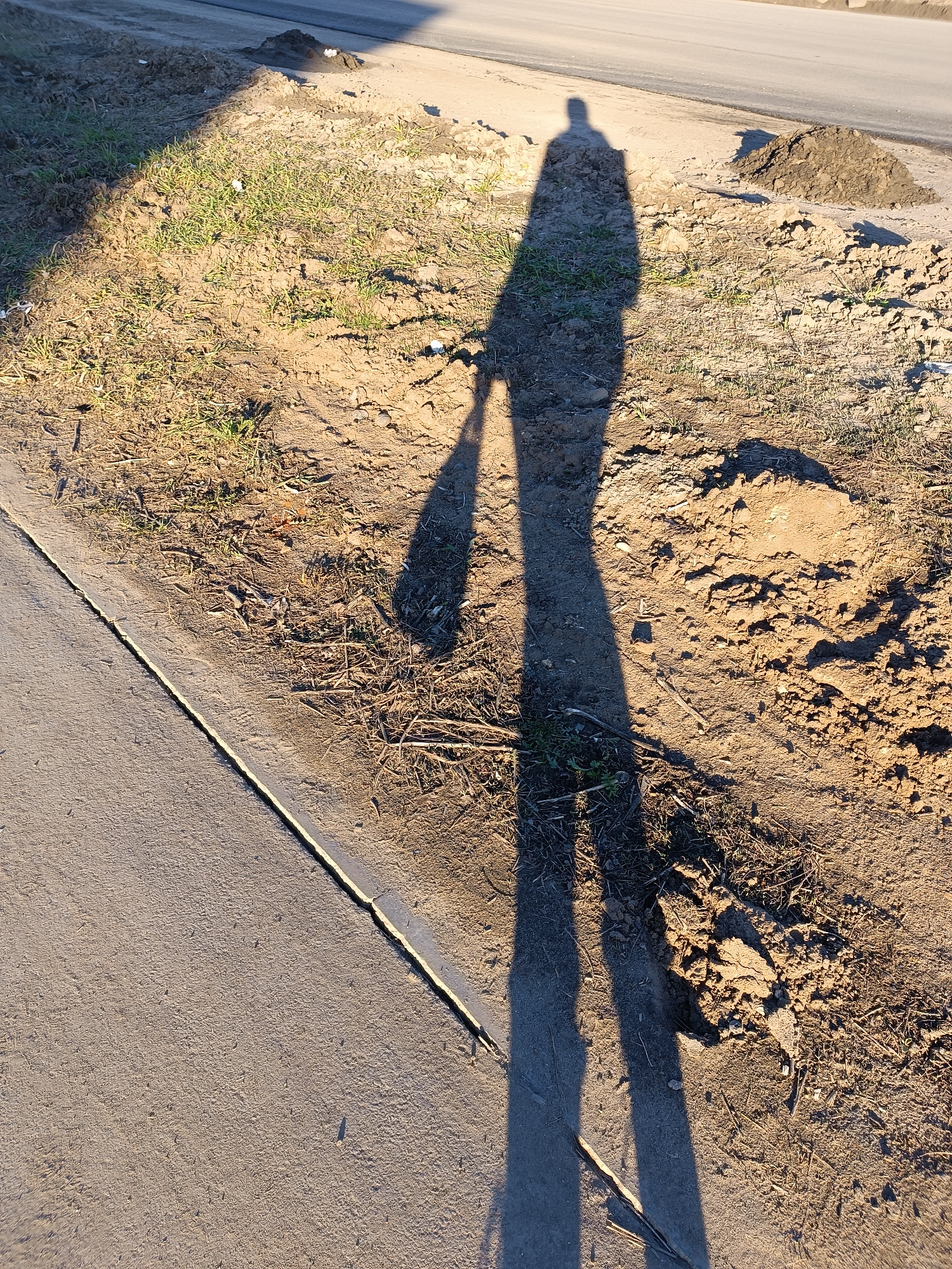 The image depicts a shadow of a person cast on a dirt and grass area adjacent to a concrete sidewalk and paved road. The shadow suggests the person is holding an object, possibly a bag or stick, in on…read more