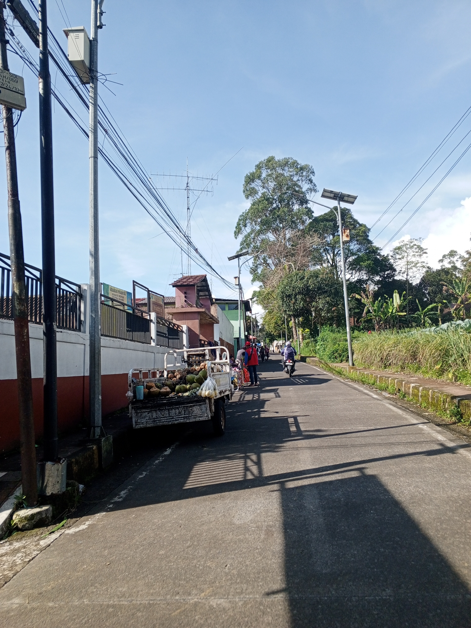 A daytime shot in Usab, Philippines, shows a narrow asphalt road lined with vegetation on the right and a building/fence structure on the left. A small vehicle, possibly a cart or small truck, filled…read more