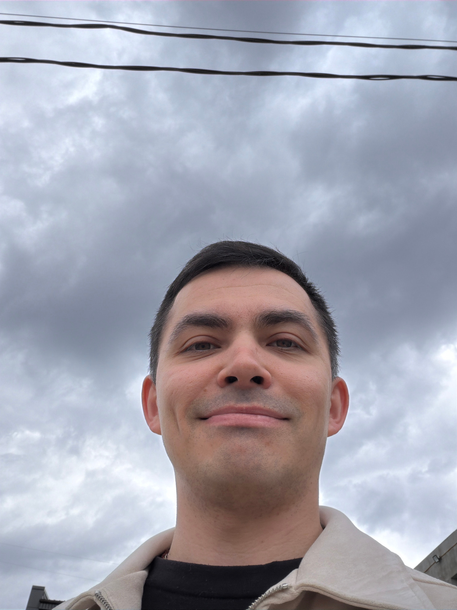 The image shows a medium close-up of a man with dark hair and fair skin. He is wearing a light-colored jacket over a black shirt. The background is a cloudy sky. Electrical wires run along the left si…read more