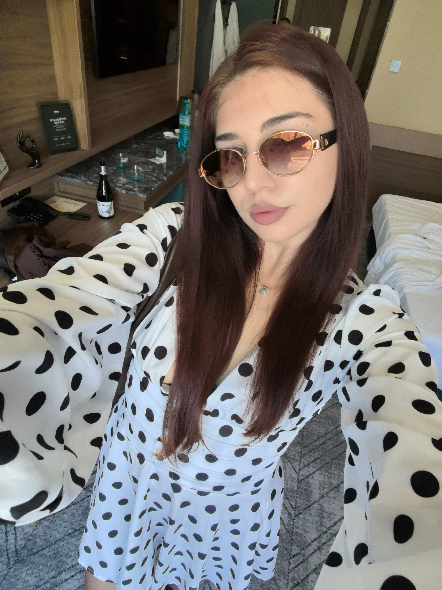 A woman with auburn hair and oval sunglasses is standing in a hotel room, wearing a white polka-dot dress with long, puffed sleeves. She is positioned in front of a bed and dresser. A bottle of wine a…read more