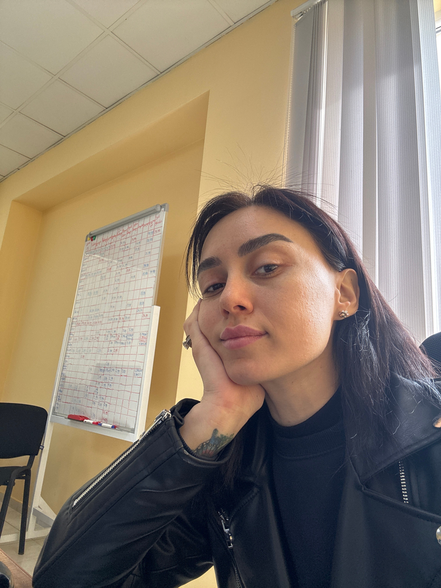 A woman with dark hair and a tattoo on her left forearm is resting her face on her hand. She's wearing a black leather jacket over a black top. Behind her, a whiteboard is filled with handwritten note…read more