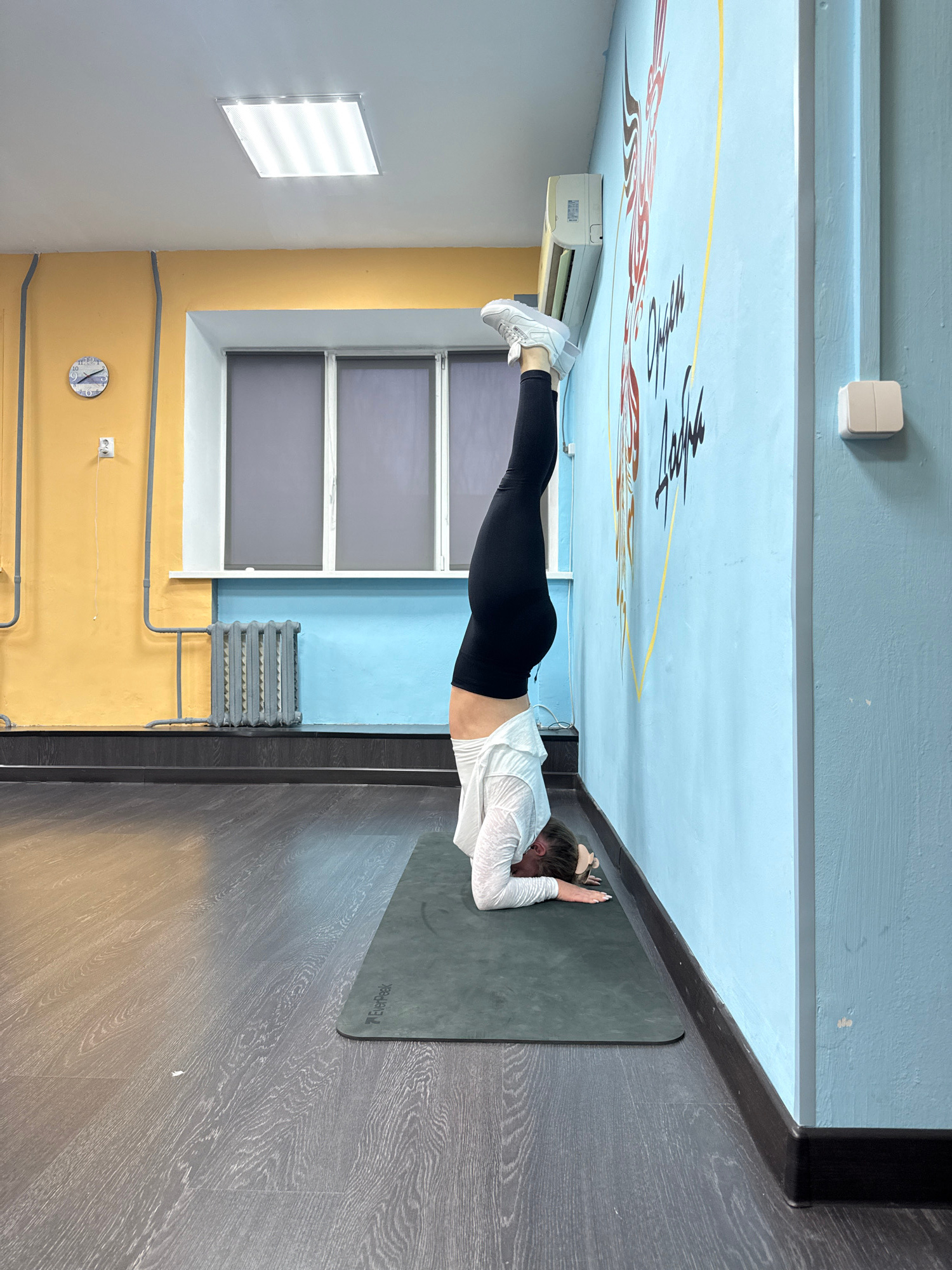 A woman is performing a forearm plank on a gray yoga mat in a room with a unique color scheme. The upper part of the wall is light blue, decorated with painted designs, and the lower part is yellow. T…read more