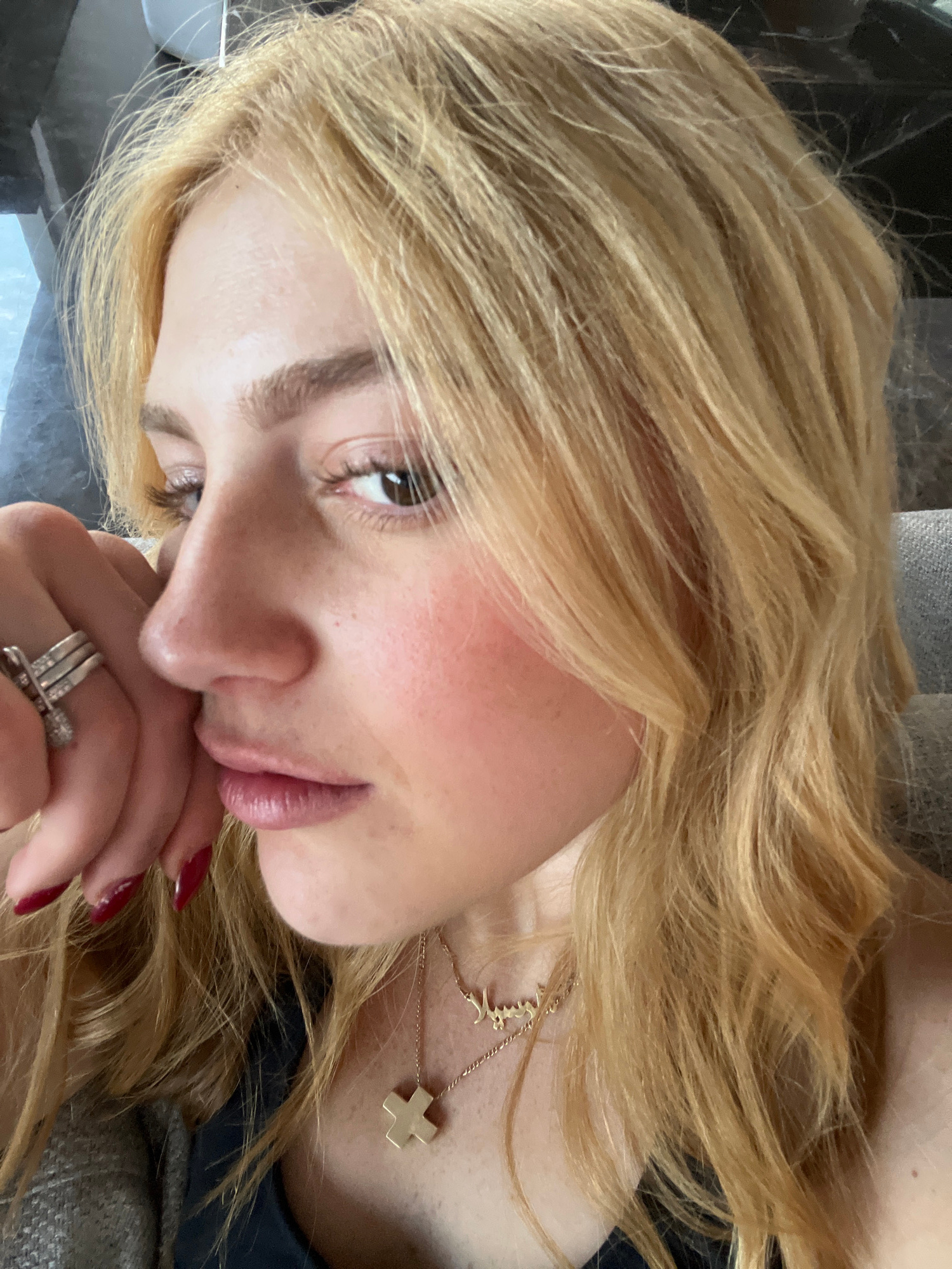 A close-up portrait features a female subject with fair skin, light freckles, and long, wavy, golden blonde hair falling over her shoulders. Her brown eyes, enhanced with elongated eyelashes and a lig…read more